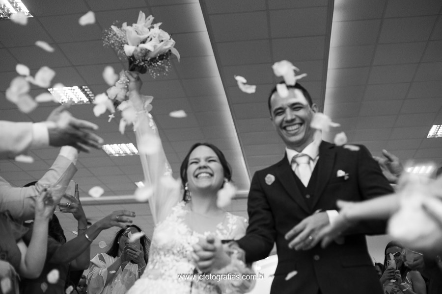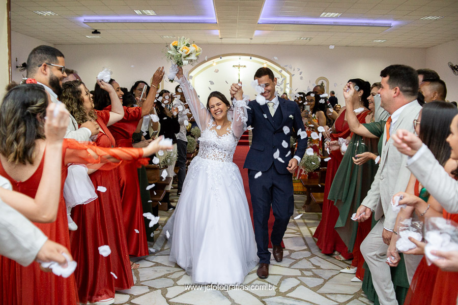 Os noivos saíram cobertos por pétalas e uma leve chuva de bençãos .