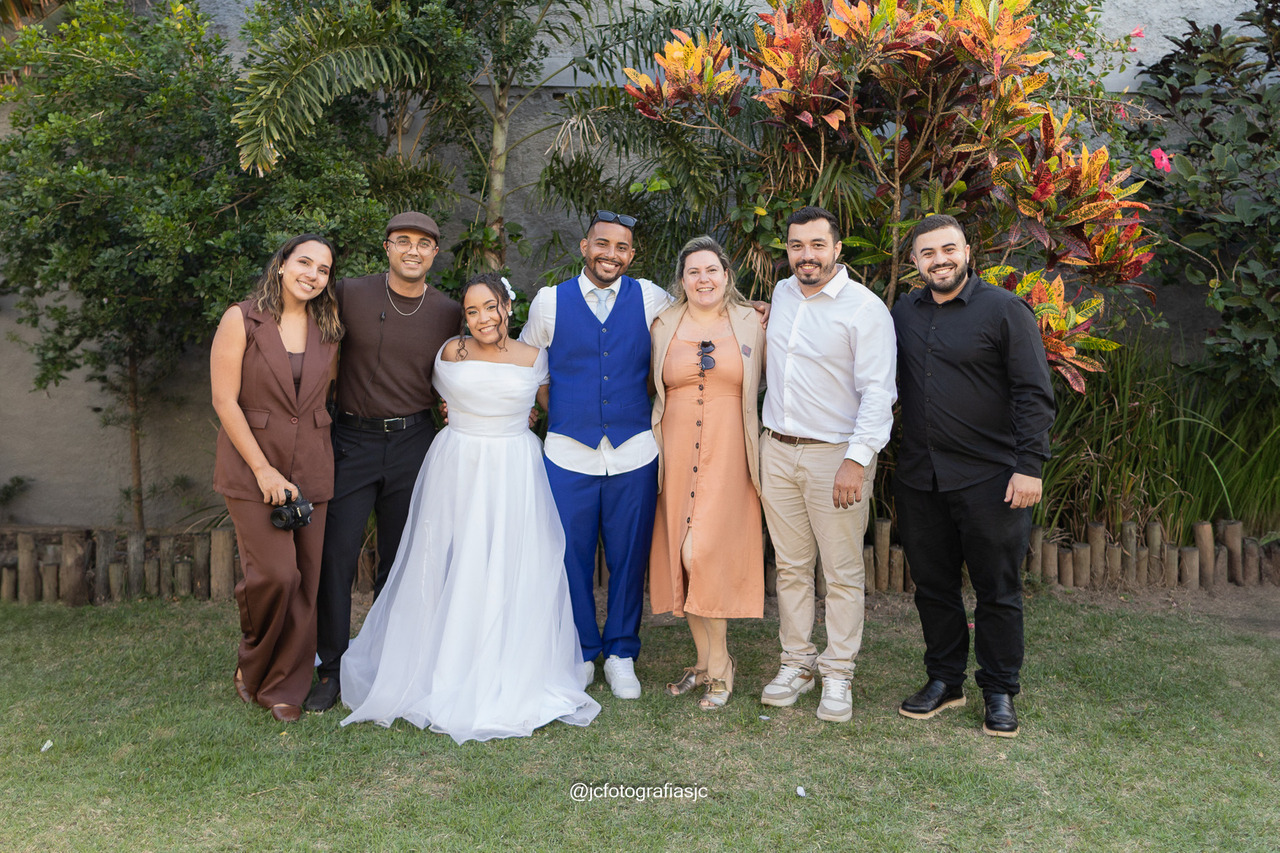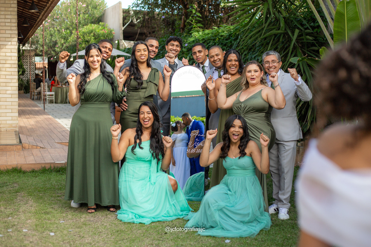 Com energias renovadas, voltamos às fotos protocolares, dessa vez com padrinhos, familiares e amigos. Foi uma verdadeira celebração em forma de cliques, com risos, abraços e muita conexão. E claro, não podia faltar, rolou aquela trend divertida do "tempo de uma única música para fotos com todos os convidados".