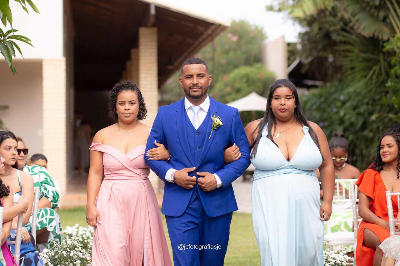 Vitor, o noivo, entrou acompanhado de suas irmãs, em um gesto cheio de afeto e representatividade. Um momento que falava sobre família, apoio e amor em várias formas.