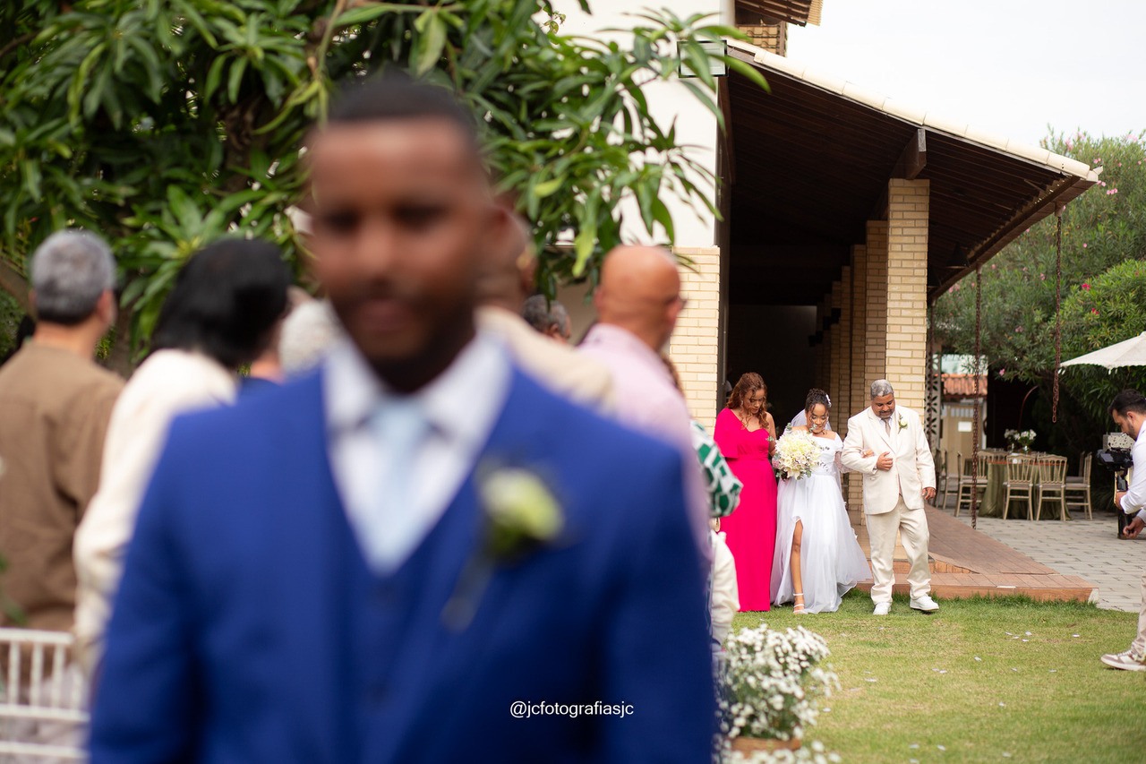 E então, o grande instante. Ana Beatriz surgiu ao lado de seus pais, irradiando beleza, serenidade e emoção. A caminhada até o altar foi mais do que uma entrada, foi a materialização de um sonho.