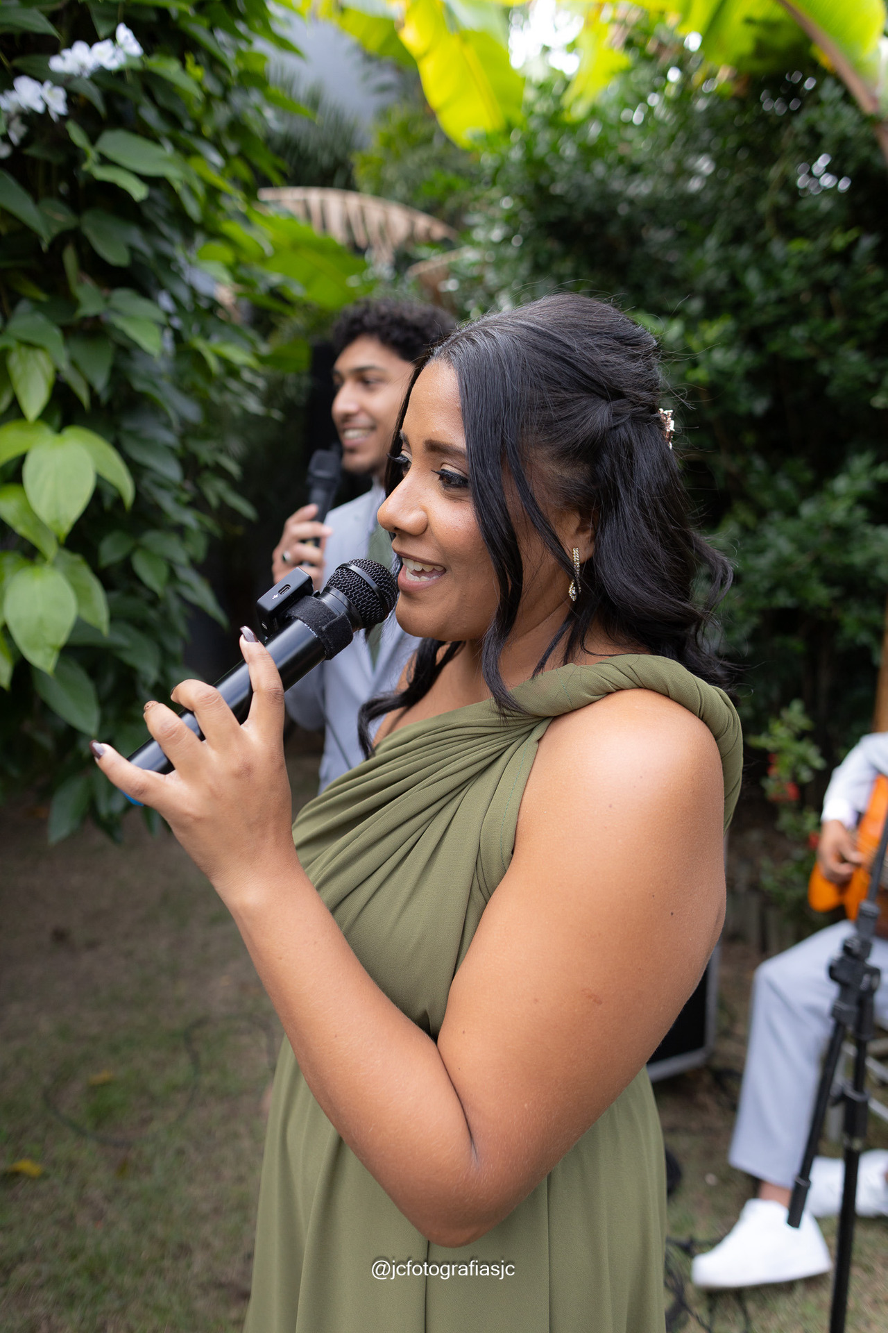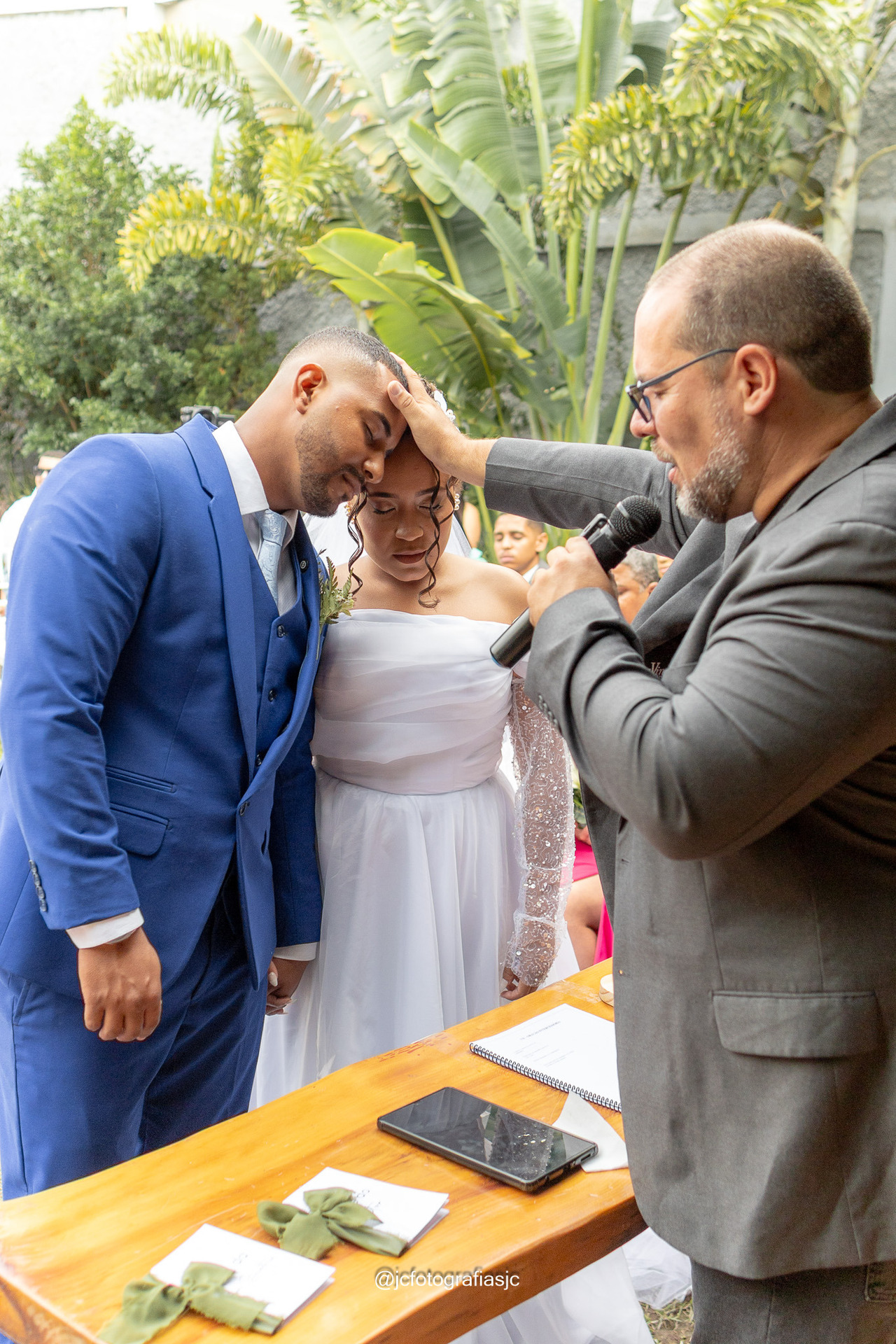 A cerimônia seguiu conduzida por alguém muito especial para o casal: o pastor e celebrante que os acompanha na caminhada espiritual. Em seu sermão, ele não apenas expressou a alegria de estar ali como testemunha desse passo tão importante, mas também falou com verdade e propósito sobre o significado real do casamento.