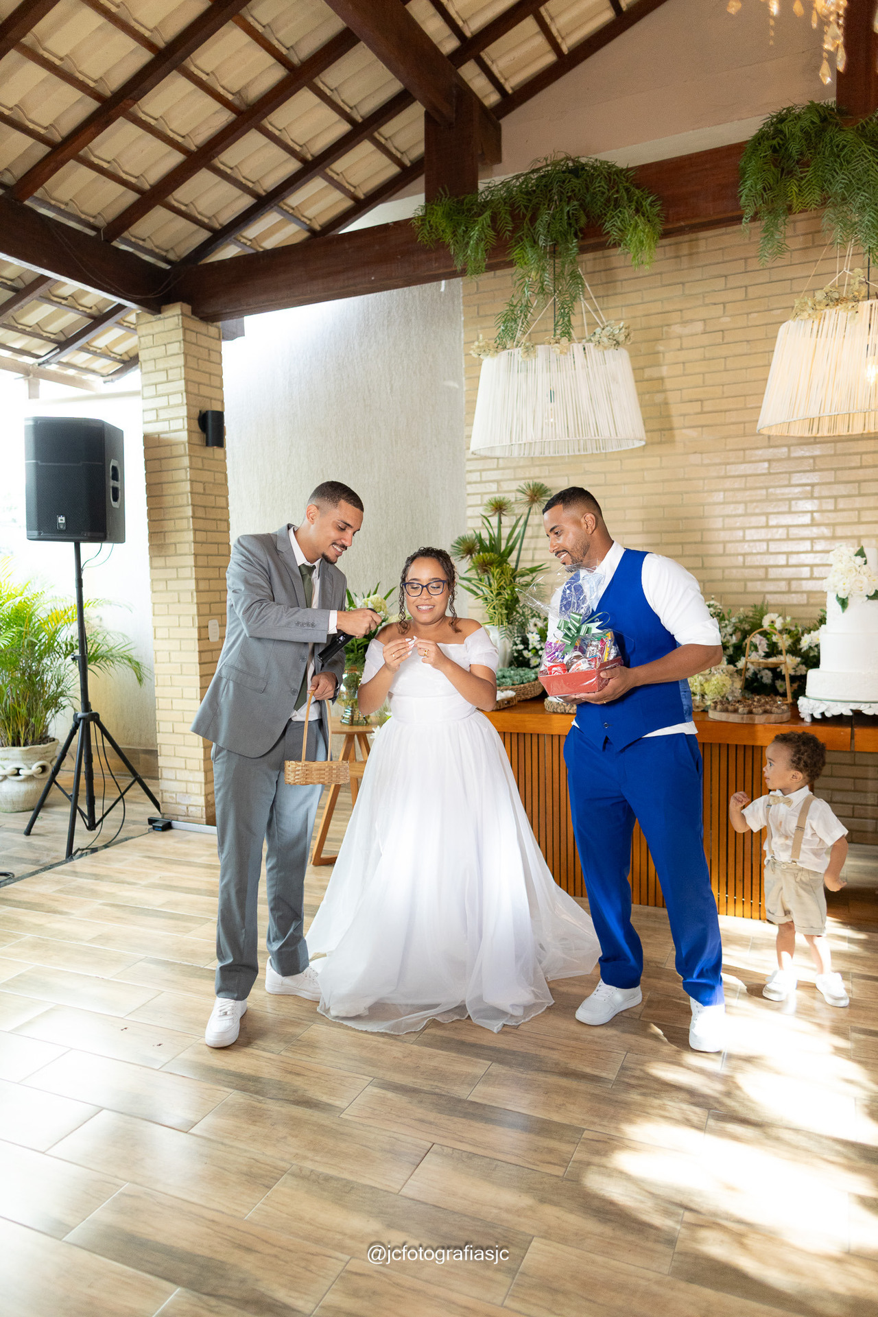 A tradicional “ação da gravata” ganhou uma versão criativa e divertida: uma rifa. Os noivos venderam tickets entre os convidados, que concorriam a uma cesta de doces caprichada. O momento foi pura descontração, arrancando risadas e incentivando a participação de todos, mais uma forma de aproximar ainda mais quem estava ali para celebrar.