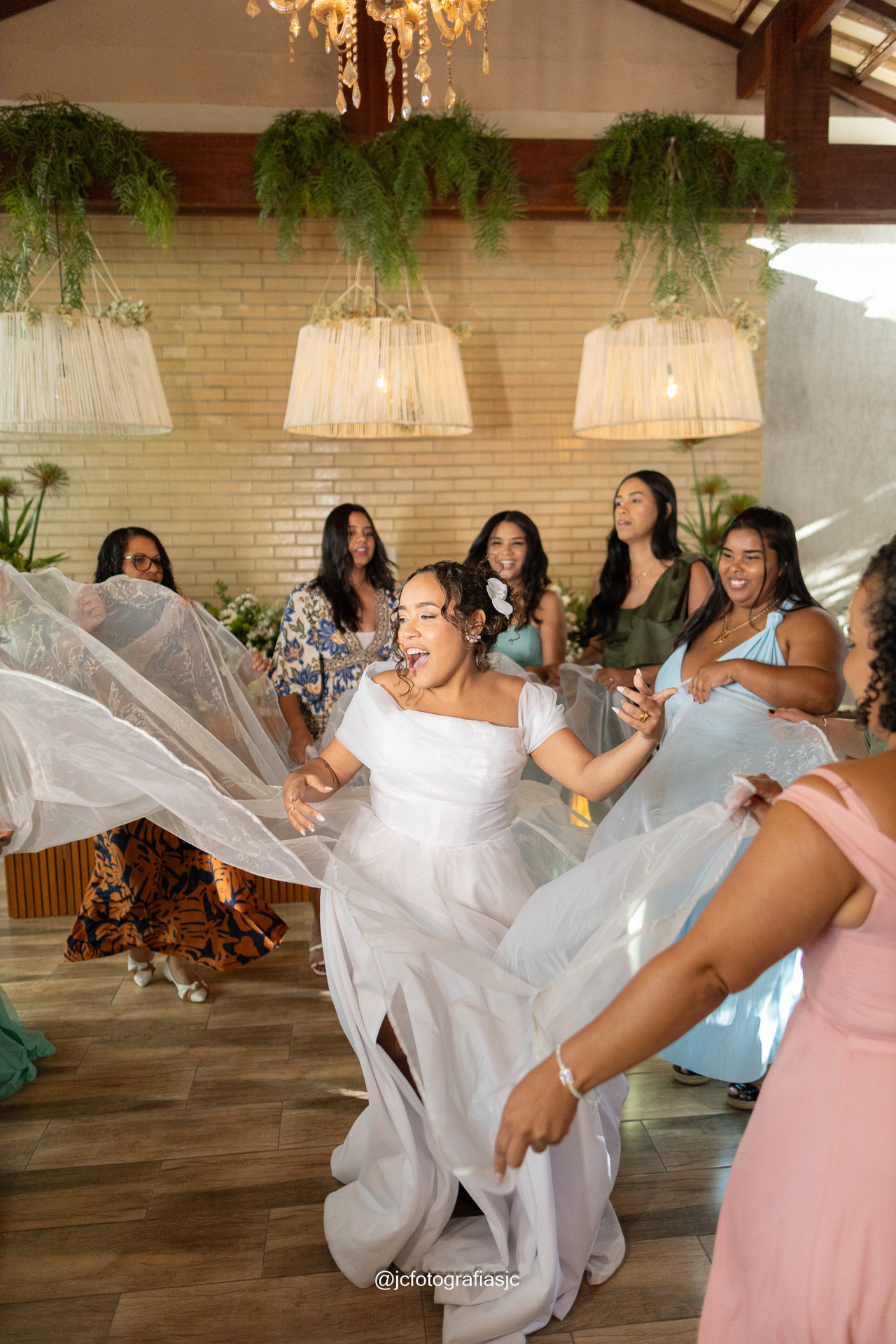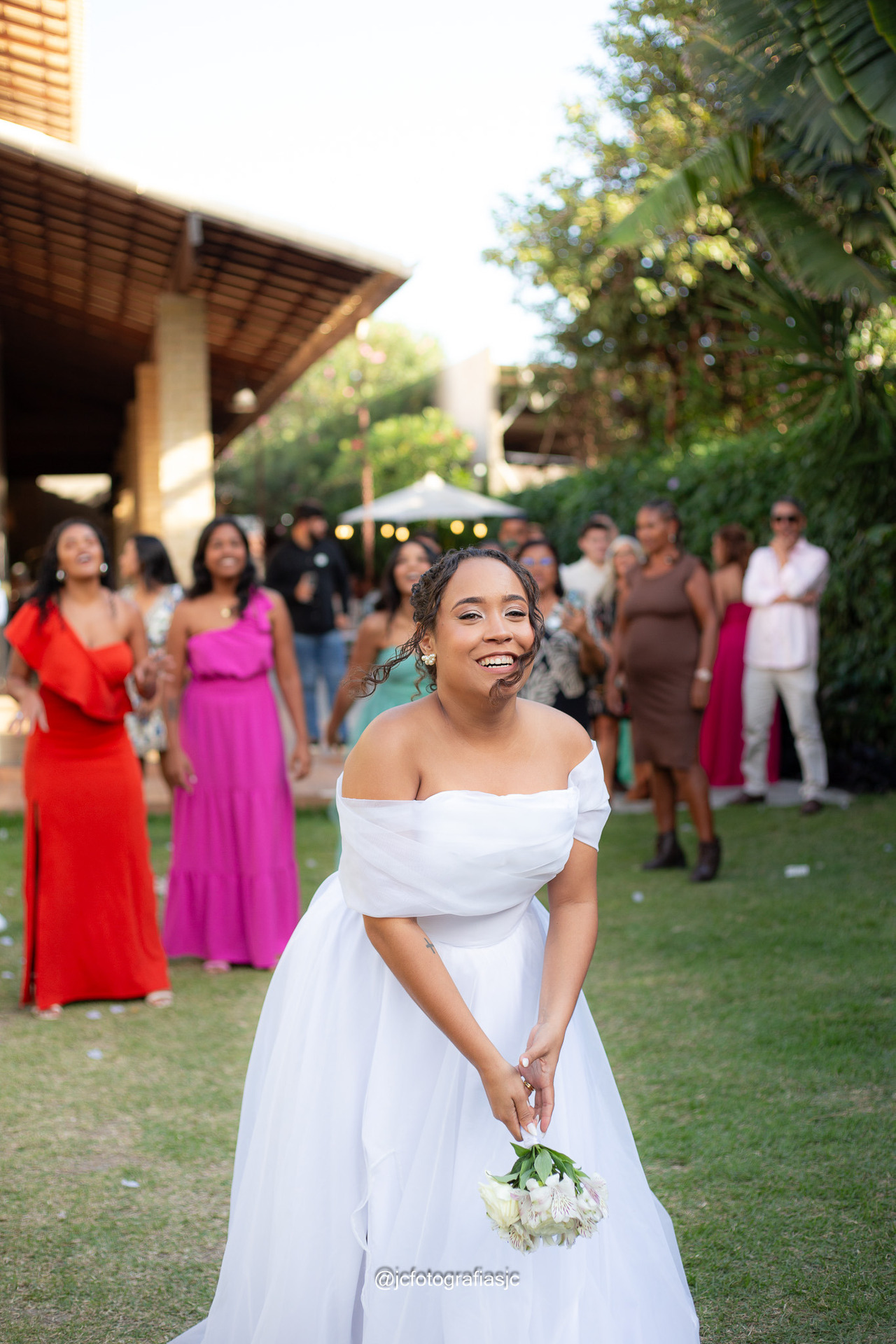 E, claro, não poderia faltar o grande encerramento: a tradicional jogada do buquê. Todas as solteiras reunidas, expectativa no ar... e mais um momento de festa compartilhado, cercado de sorrisos, brincadeiras e muita torcida.