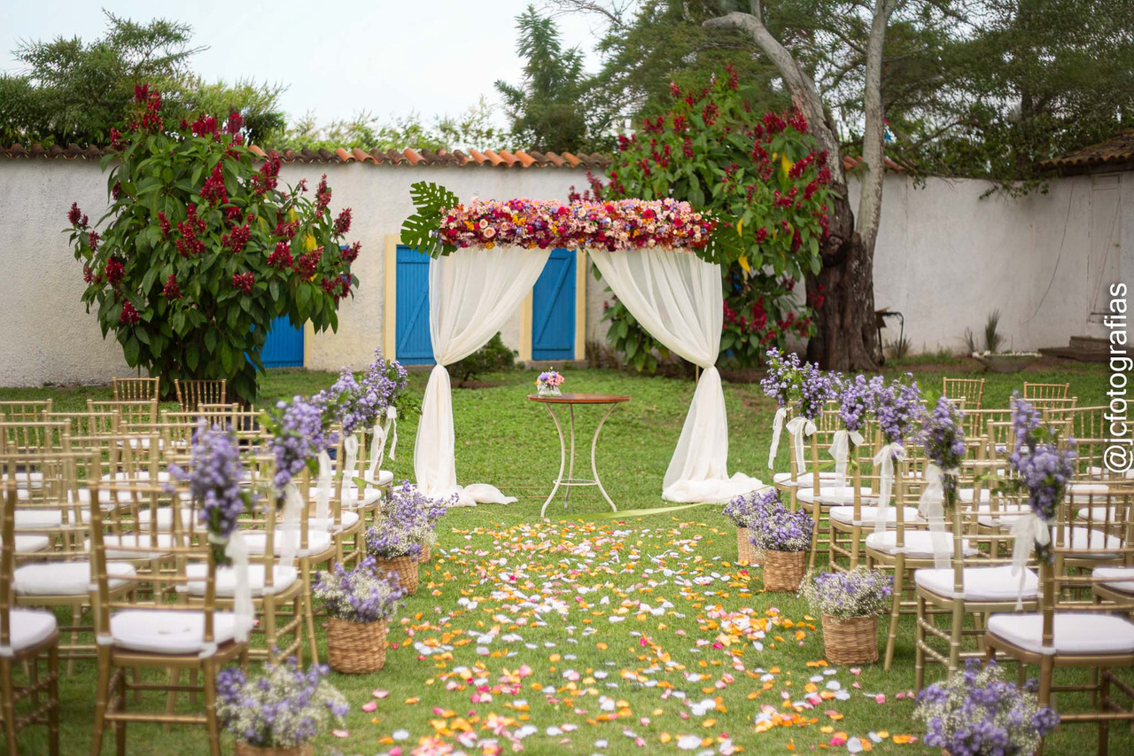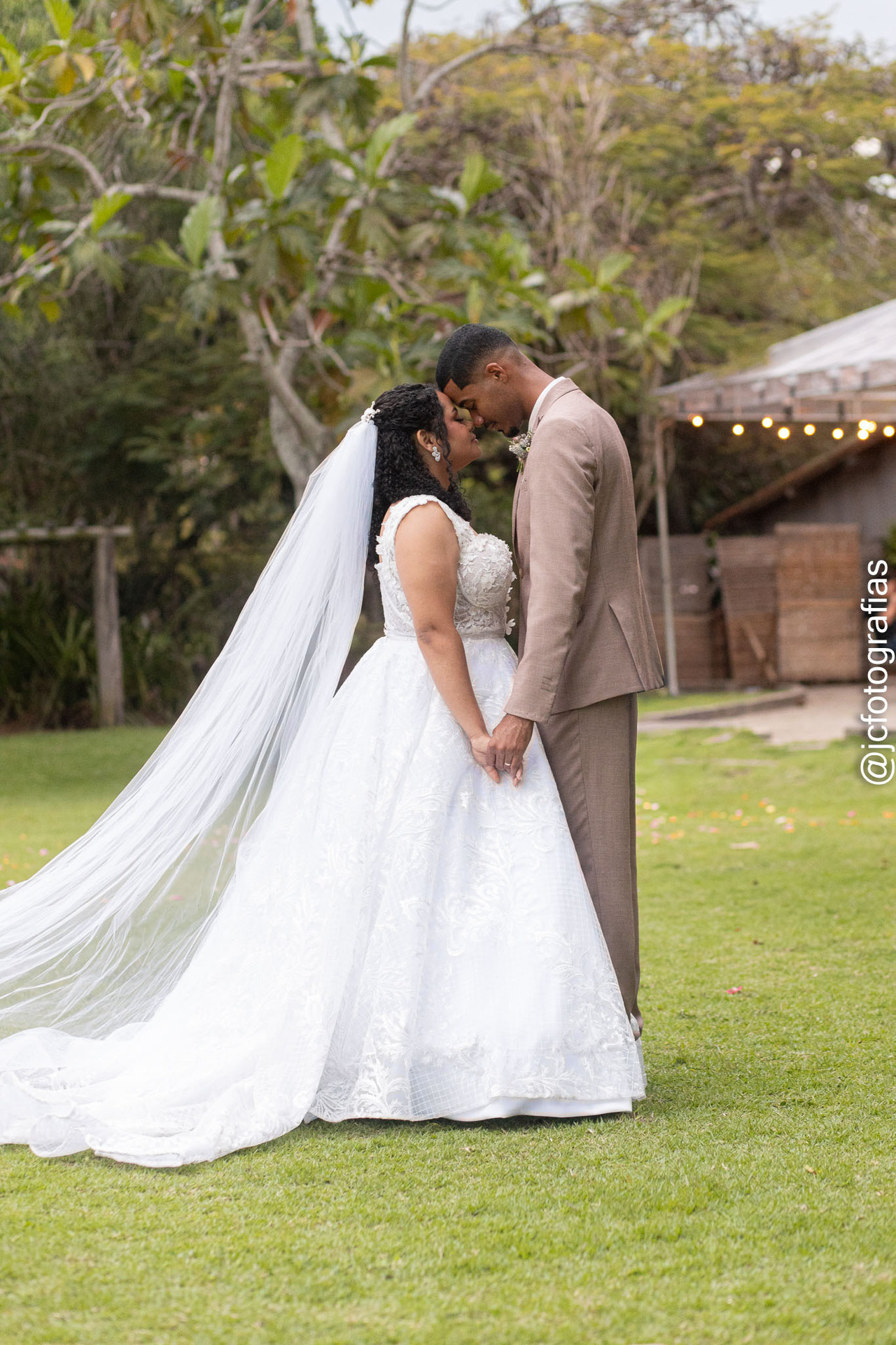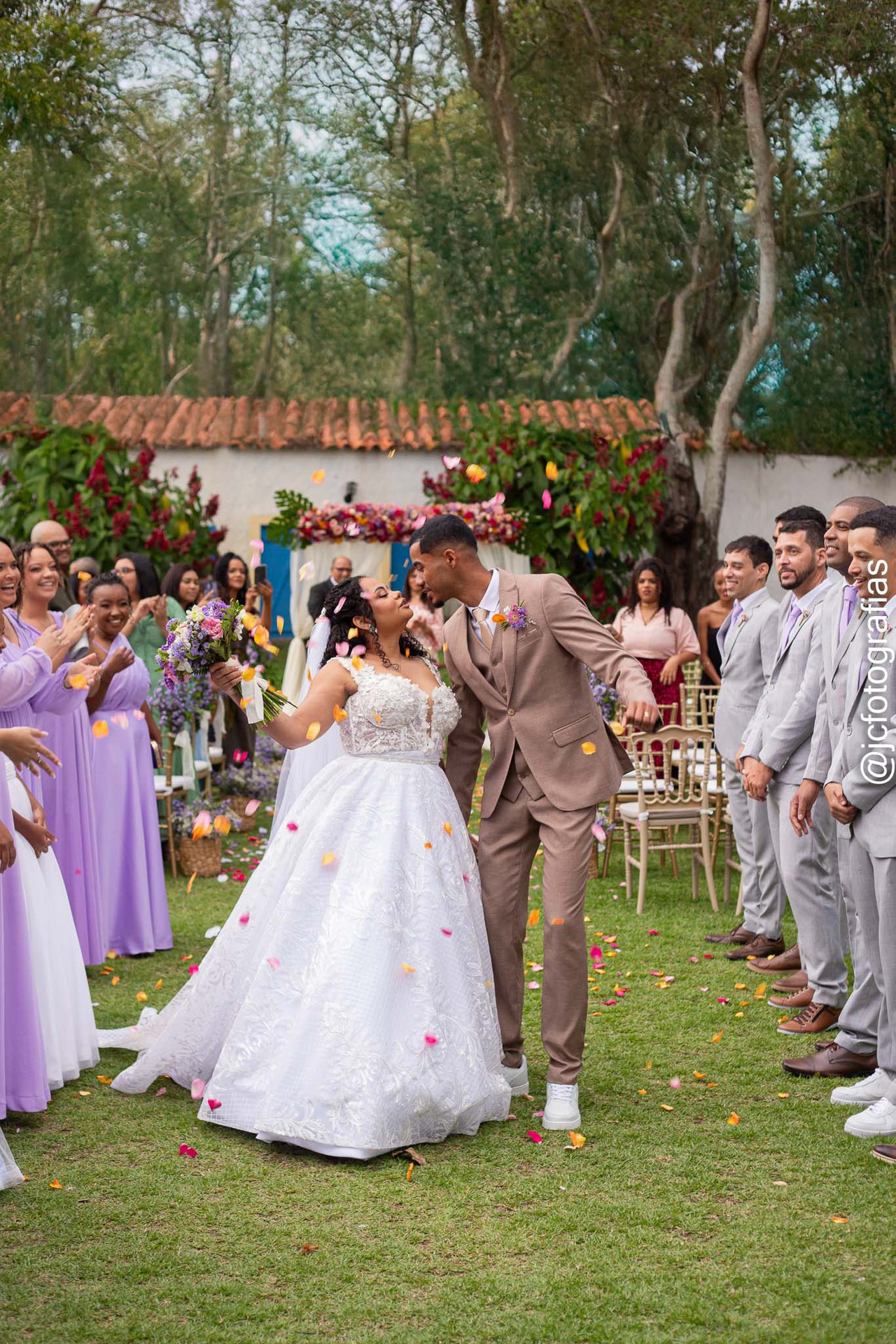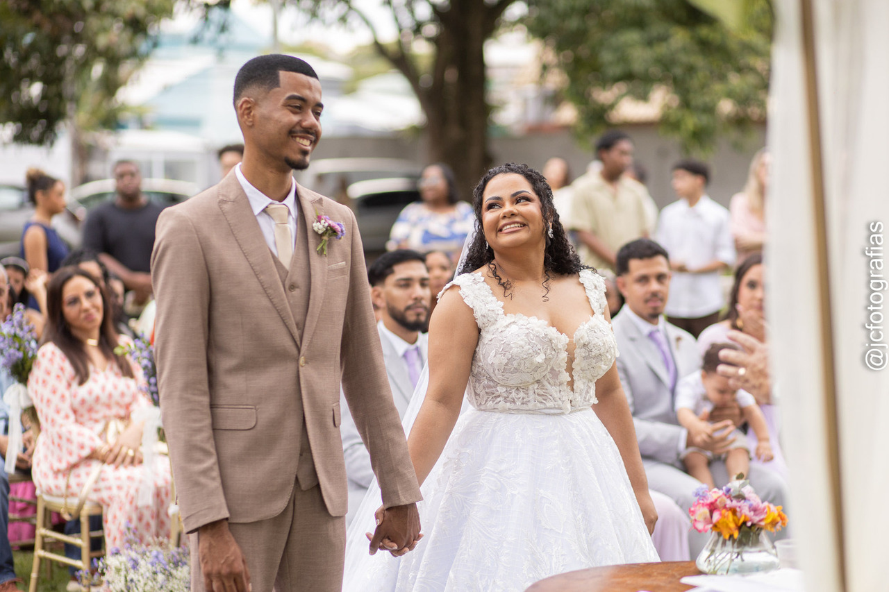 A cerimônia aconteceu no Espaço Boa Vista, em Rio das Ostras, sob a luz suave do entardecer, escolha perfeita para quem sonha com fotos naturais e uma atmosfera acolhedora.