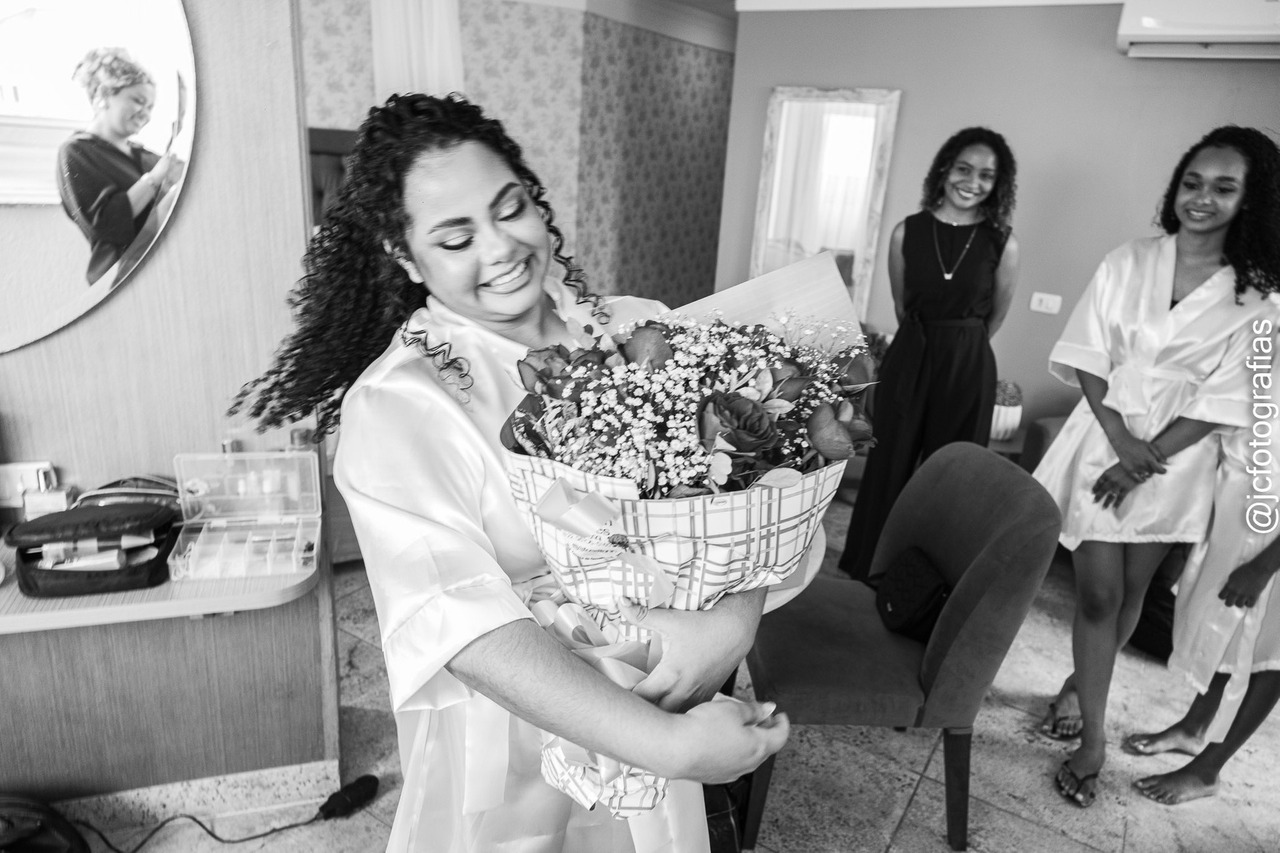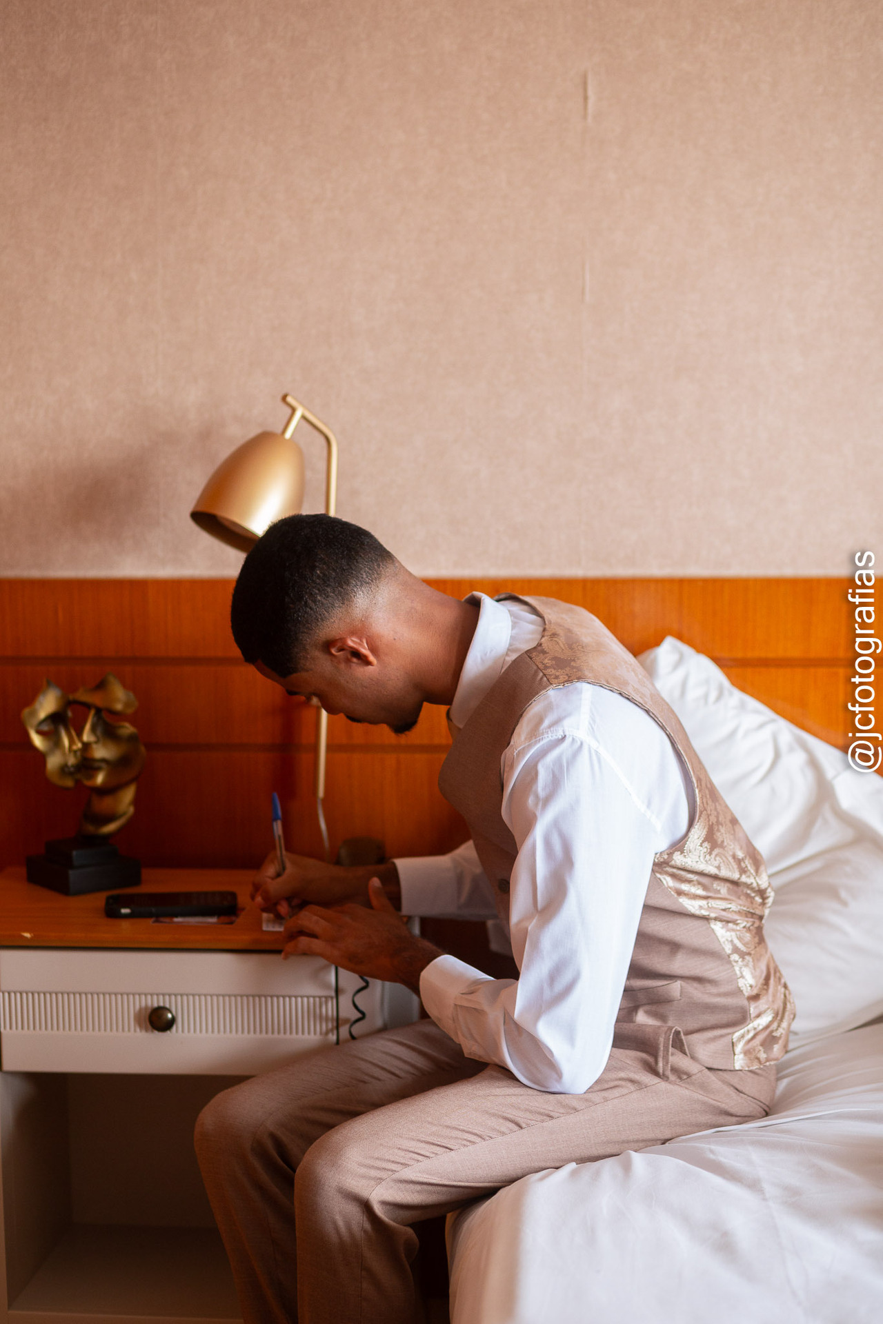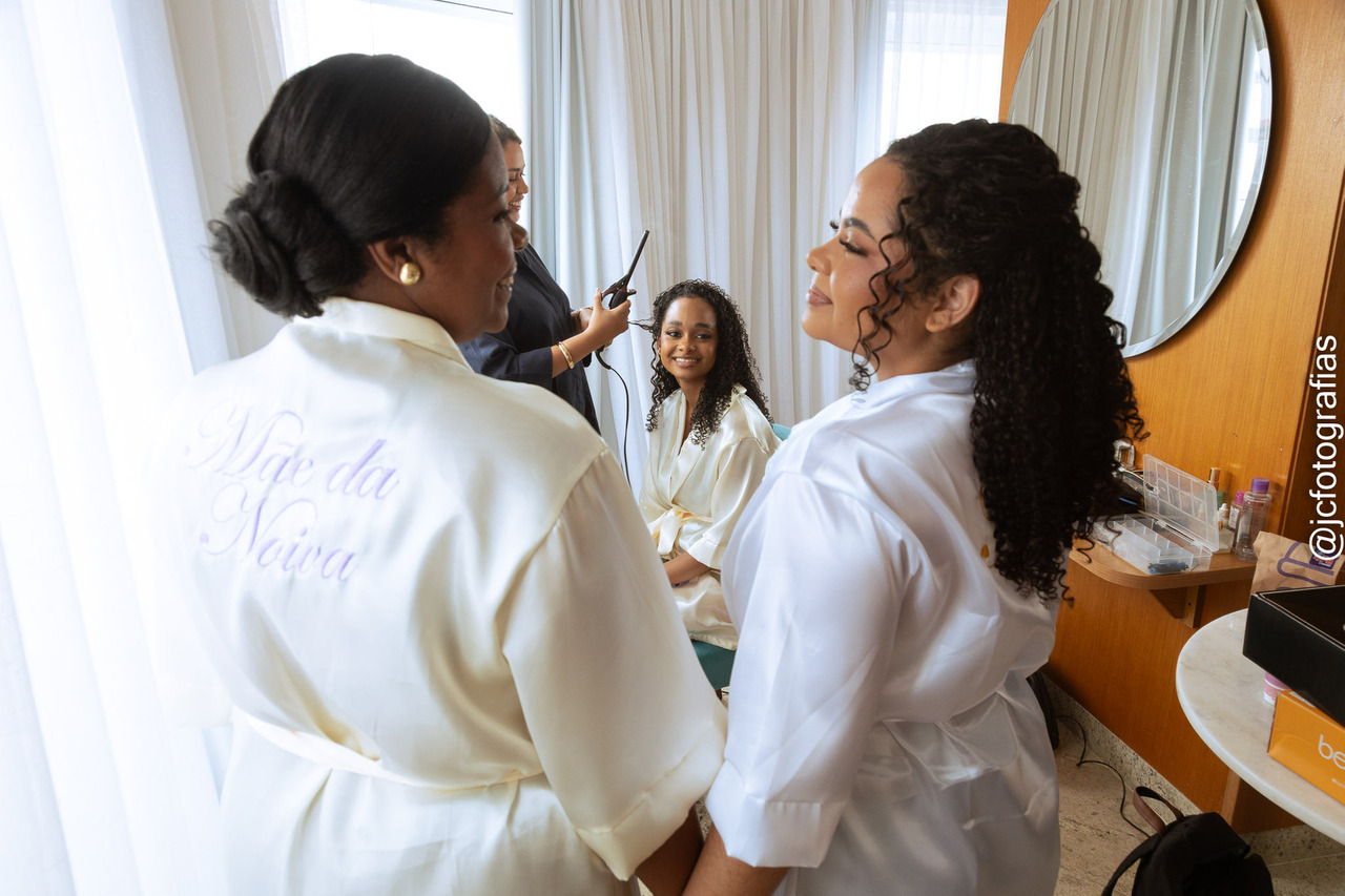 O dia começou no Hotel Royal Urban, em Macaé, onde a noiva e o noivo se prepararam em quartos separados, ambos cercados por pessoas queridas.