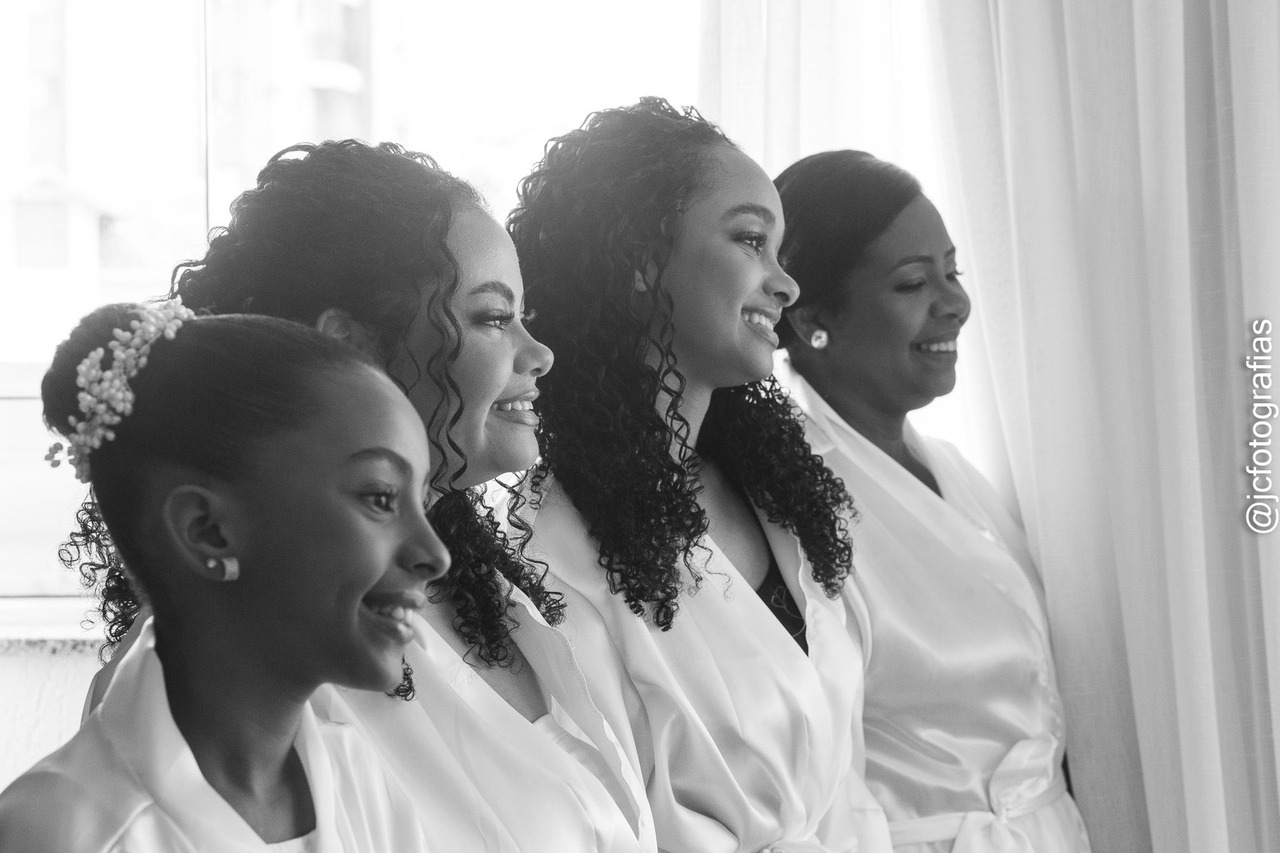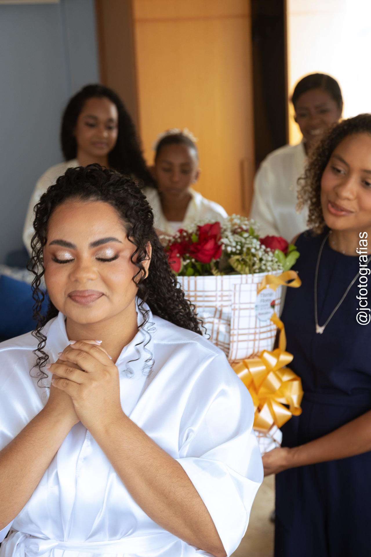 No quarto da noiva, Mycaelle estava acompanhada de sua mãe, sua irmã (madrinha) e sua prima, que foi a daminha da cerimônia. O ambiente era tranquilo, embalado por uma playlist de louvor, criando um clima de leveza.