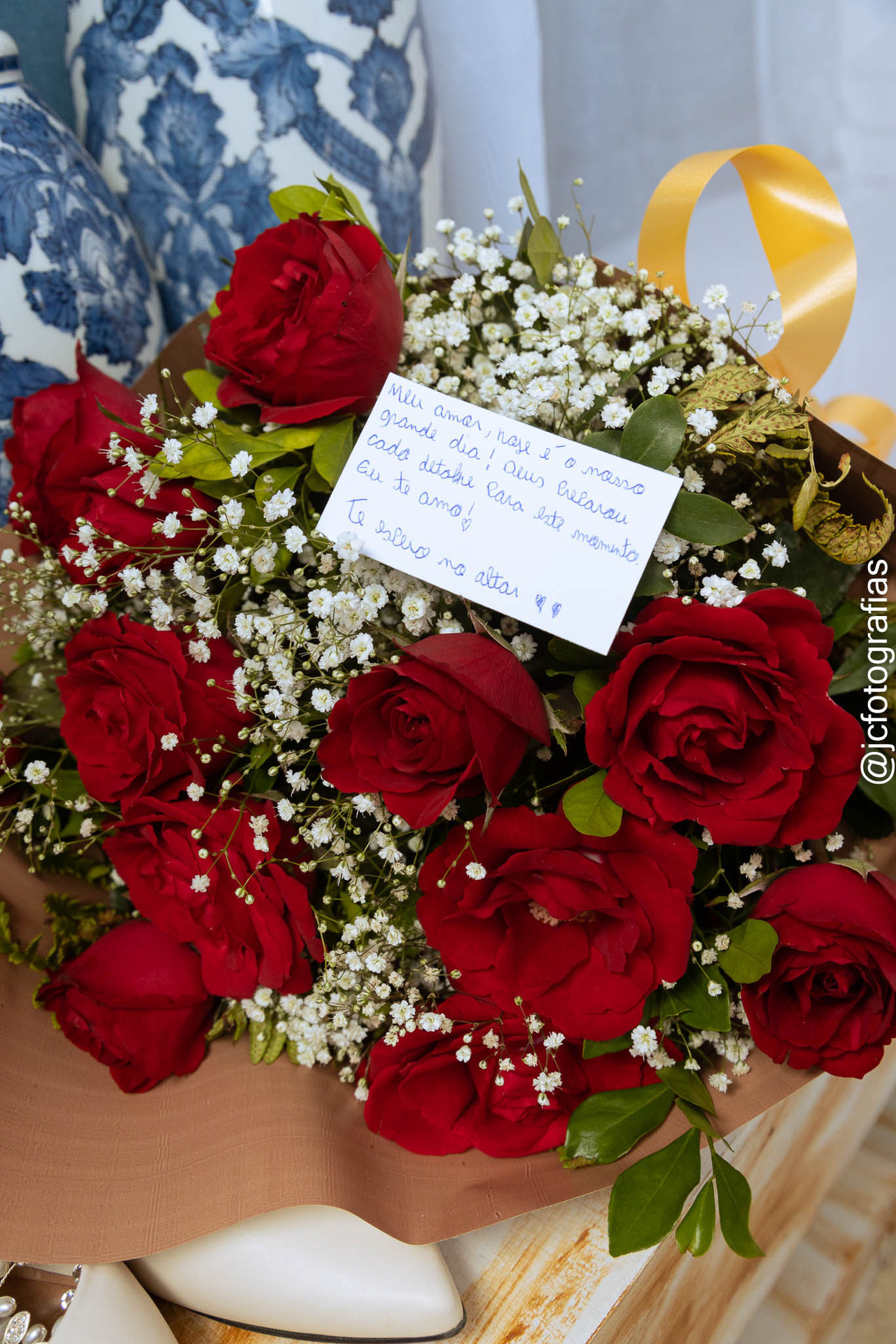 Em meio à expectativa, o noivo surpreendeu a noiva com um buquê de flores vermelhas, tradicional e romântico, acompanhado de um bilhete escrito à mão com a clássica frase: “Te espero no altar.”