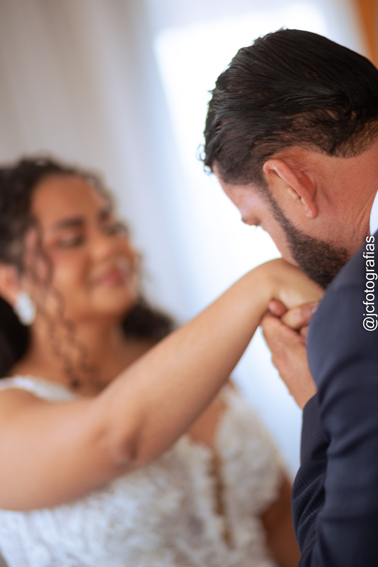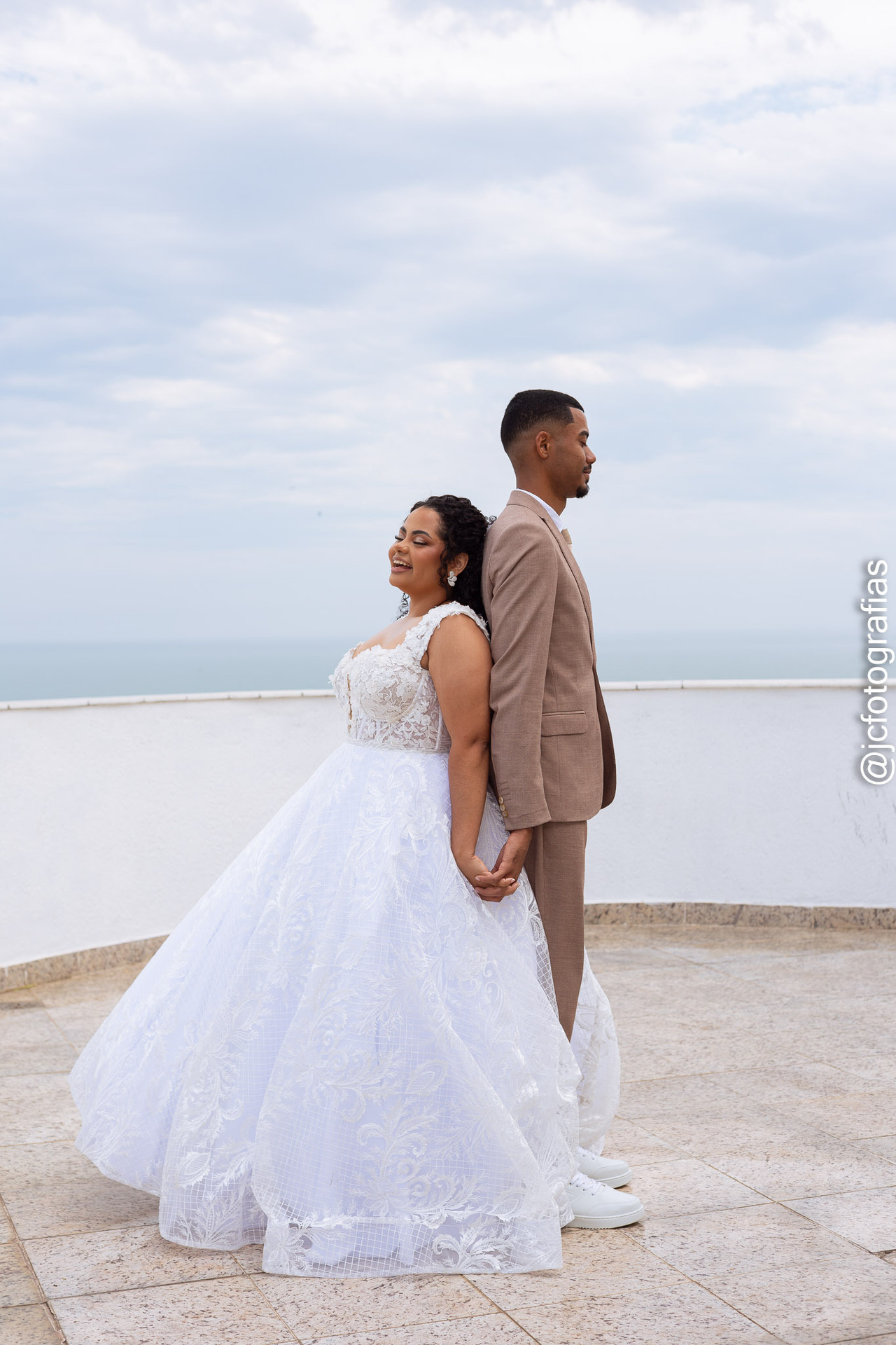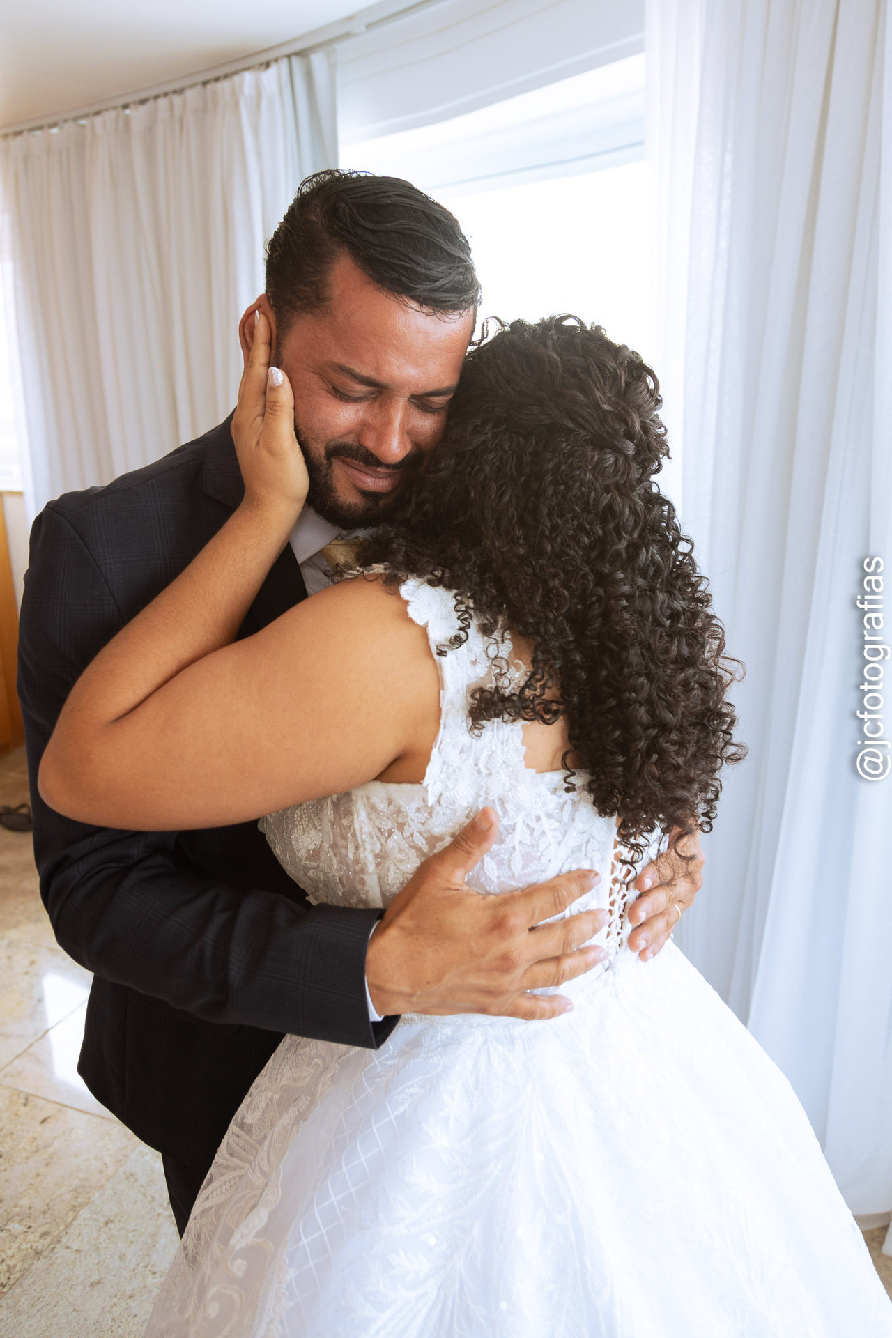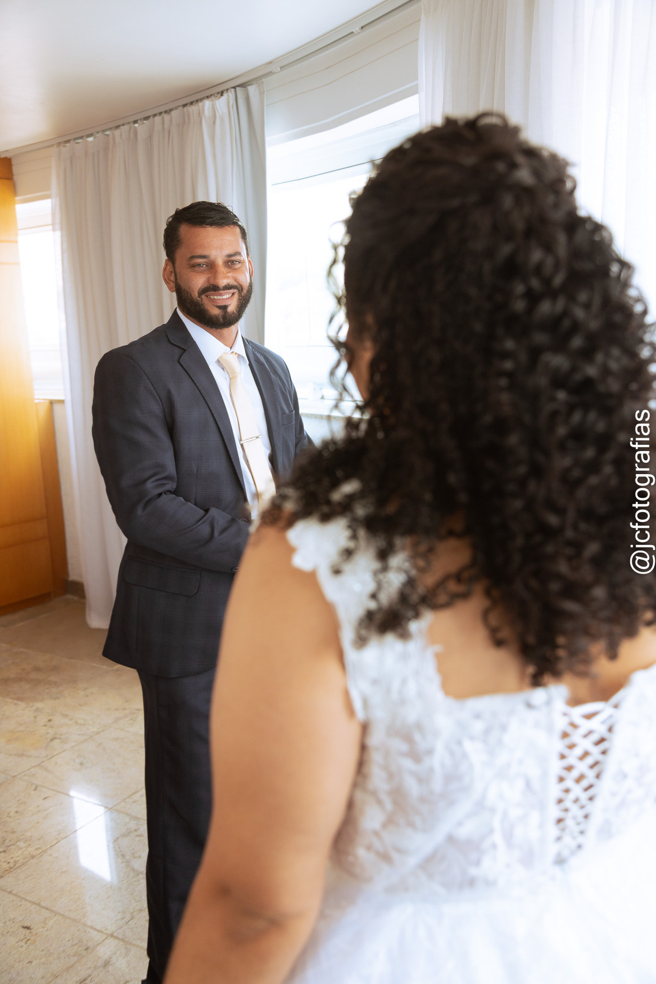 Logo após, aconteceu o first touch do casal, aquele momento em que os noivos se tocam sem se verem. A equipe JC Fotografias descobriu um terraço entre os andares dos quartos (ela no 3º andar, ele no 13º) e sugeriu que fosse ali o cenário desse encontro às cegas. O resultado foi simplesmente inesquecível: emoção pura, expectativa e o toque da criatividade que define o nosso olhar fotográfico.