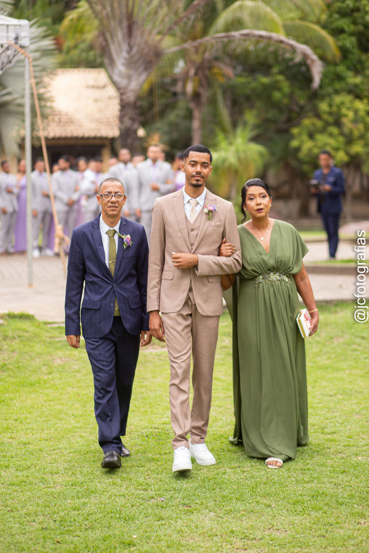 O João entrou acompanhado dos pais, seguido pelas crianças e padrinhos, enquanto a noiva Mycaelle fez sua entrada com os pais.