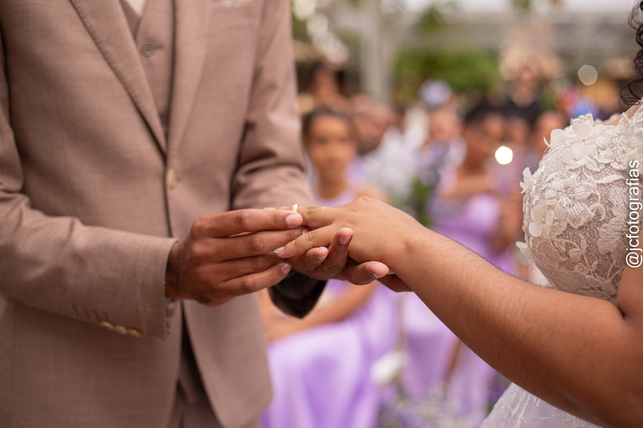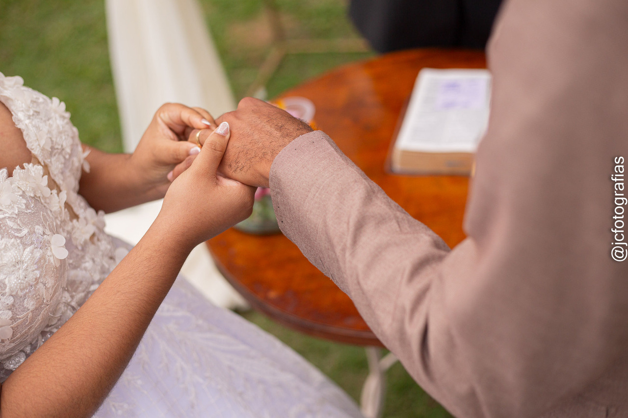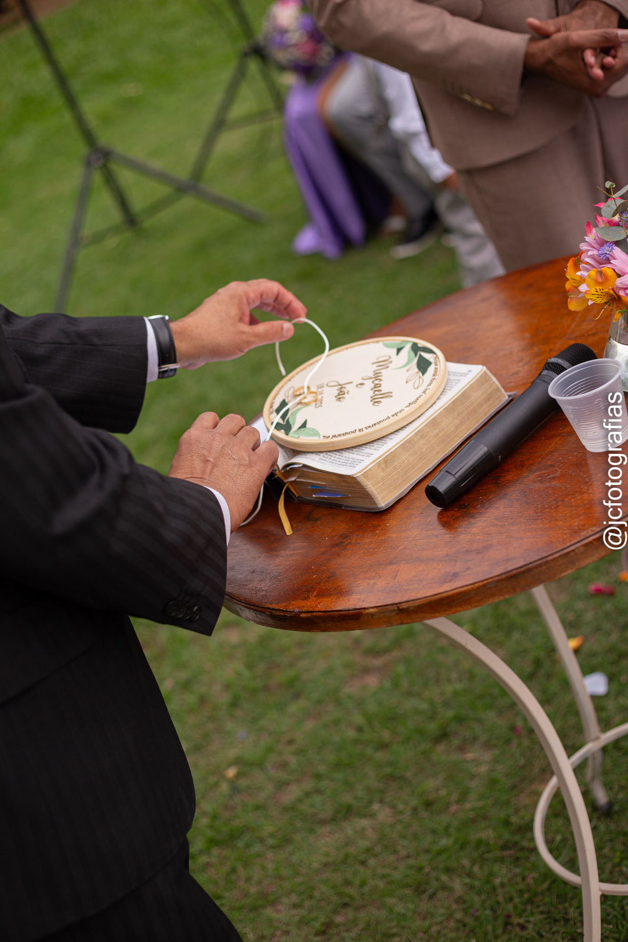 As alianças foram levadas em um bastidor bordado com o versículo de Rute 1:16, selando a cerimônia com um toque simbólico e espiritual.