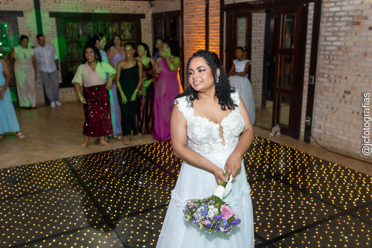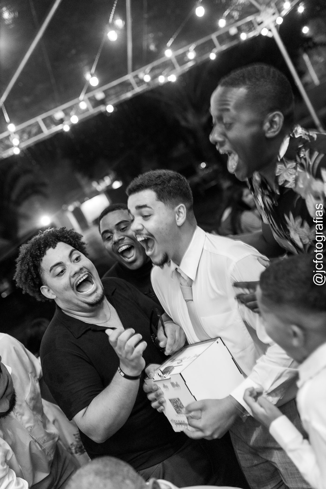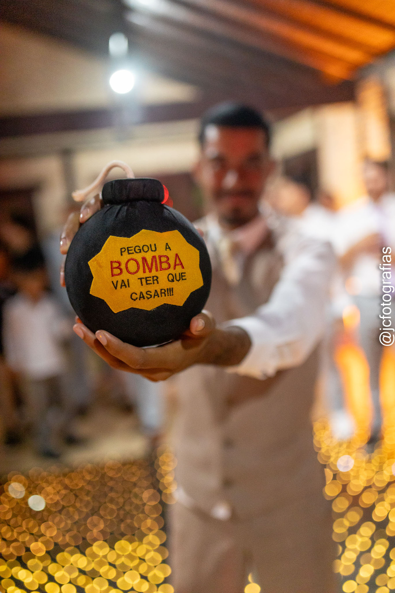 O momento do jogo do buquê e da bomba foi um dos mais animados: enquanto as mulheres disputavam o buquê, os homens se empolgaram para pegar a “bomba” lançada pelo noivo, uma ideia criativa e inusitada que rendeu risadas e fotos incríveis.