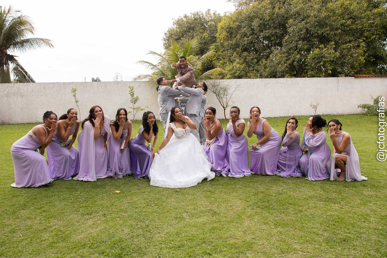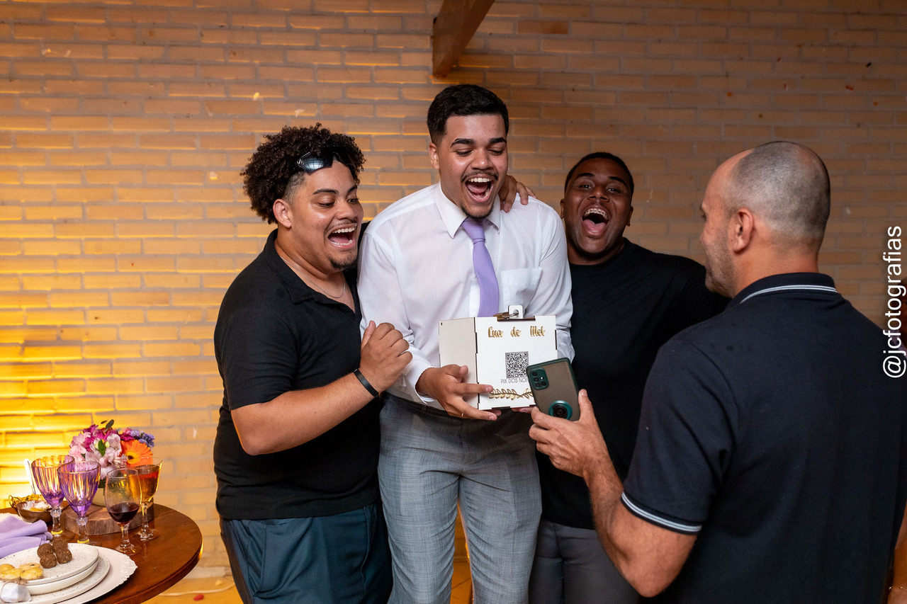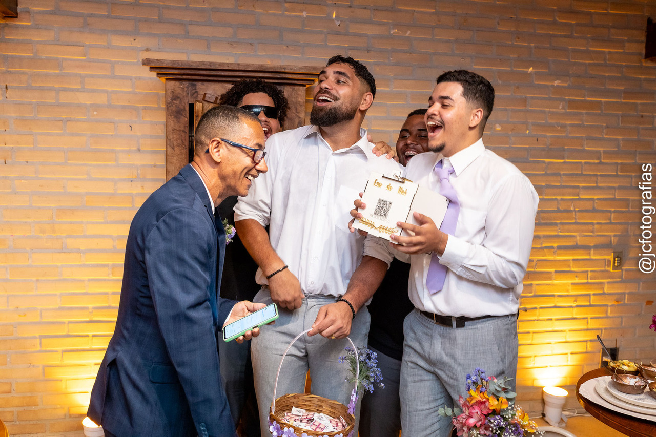 O momento do jogo do buquê e da bomba foi um dos mais animados: enquanto as mulheres disputavam o buquê, os homens se empolgaram para pegar a “bomba” lançada pelo noivo, uma ideia criativa e inusitada que rendeu risadas e fotos incríveis.
