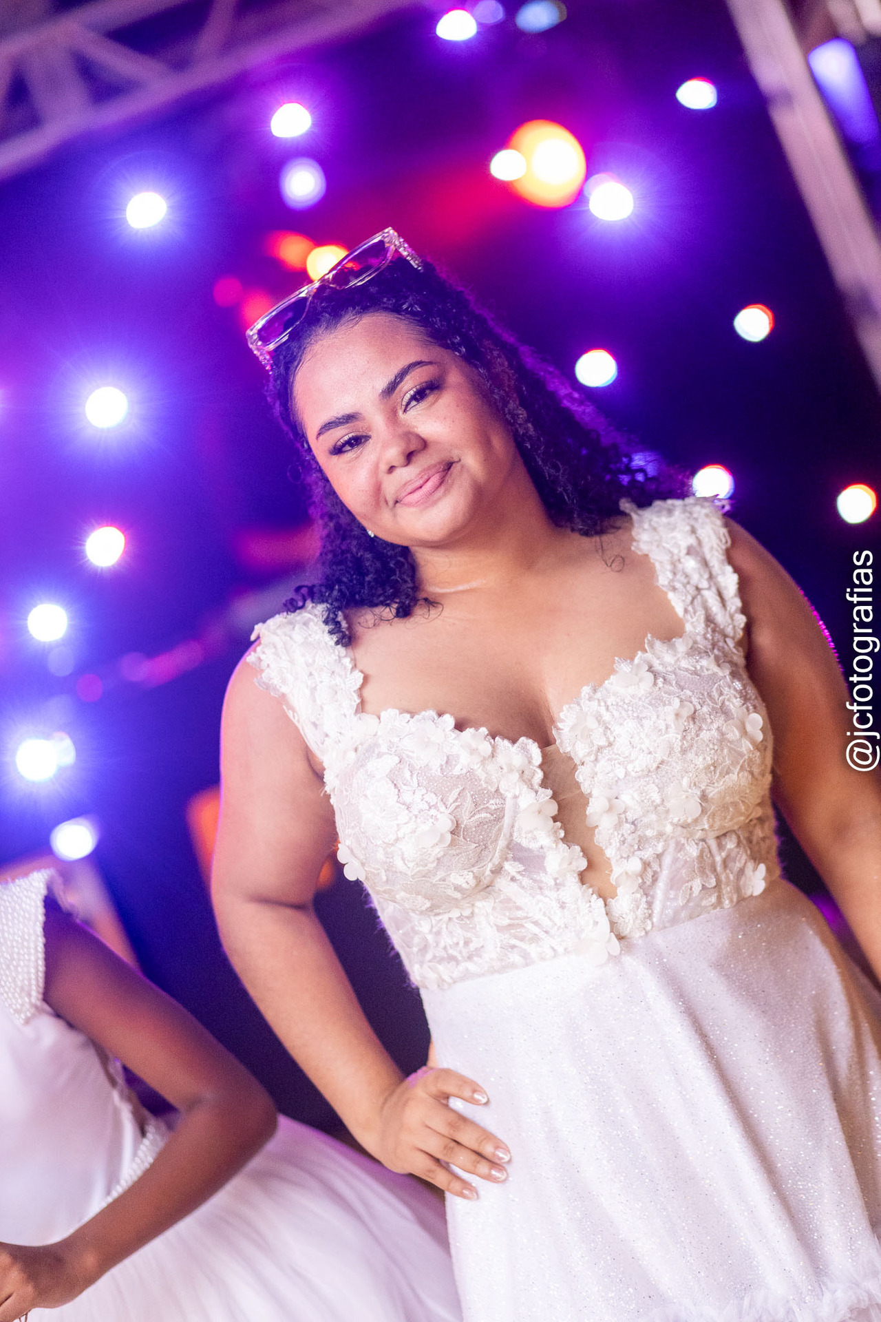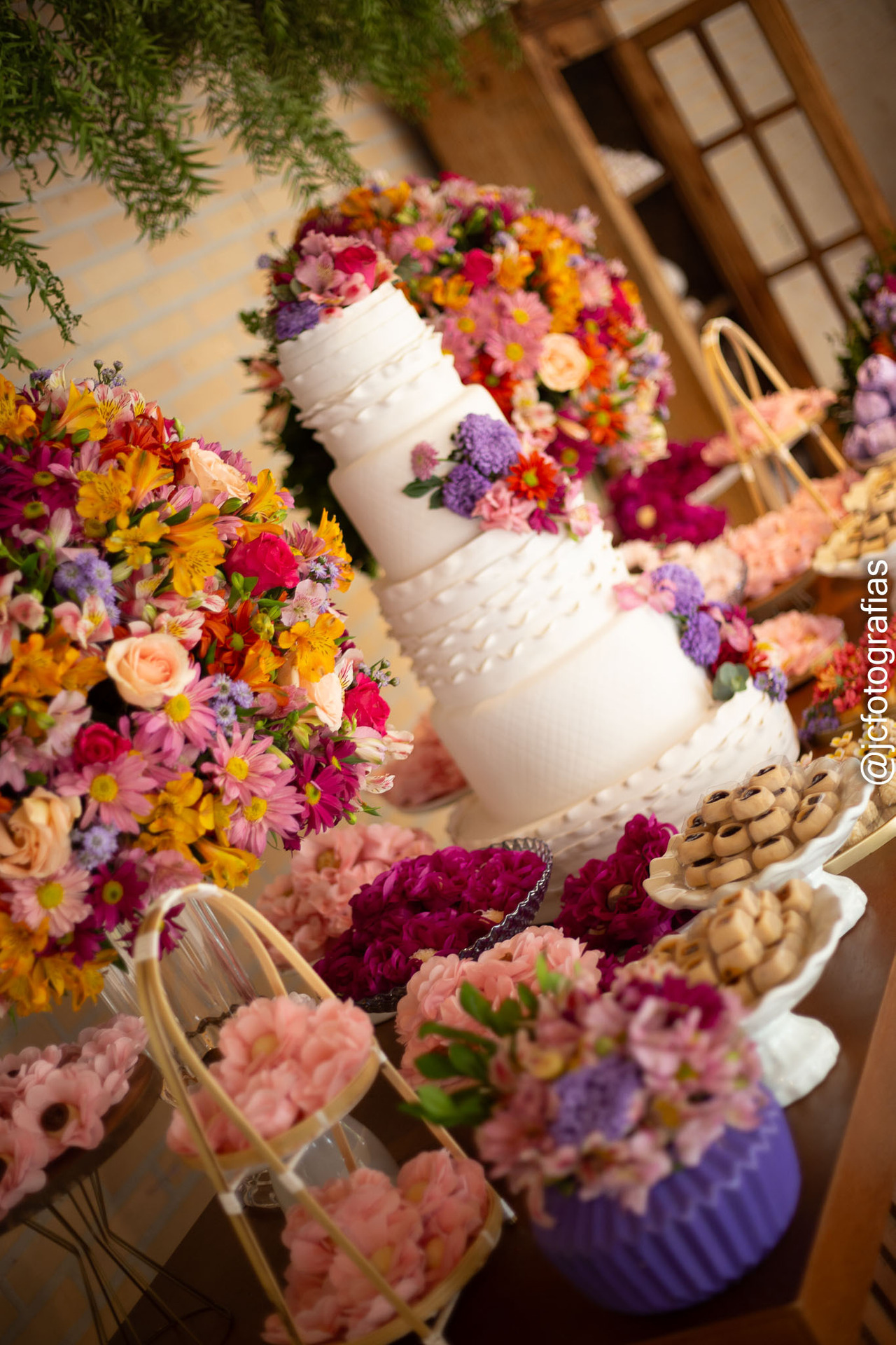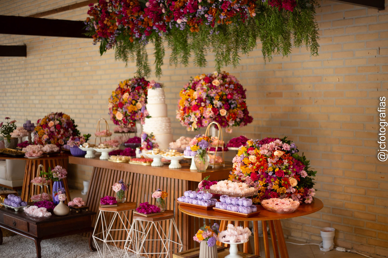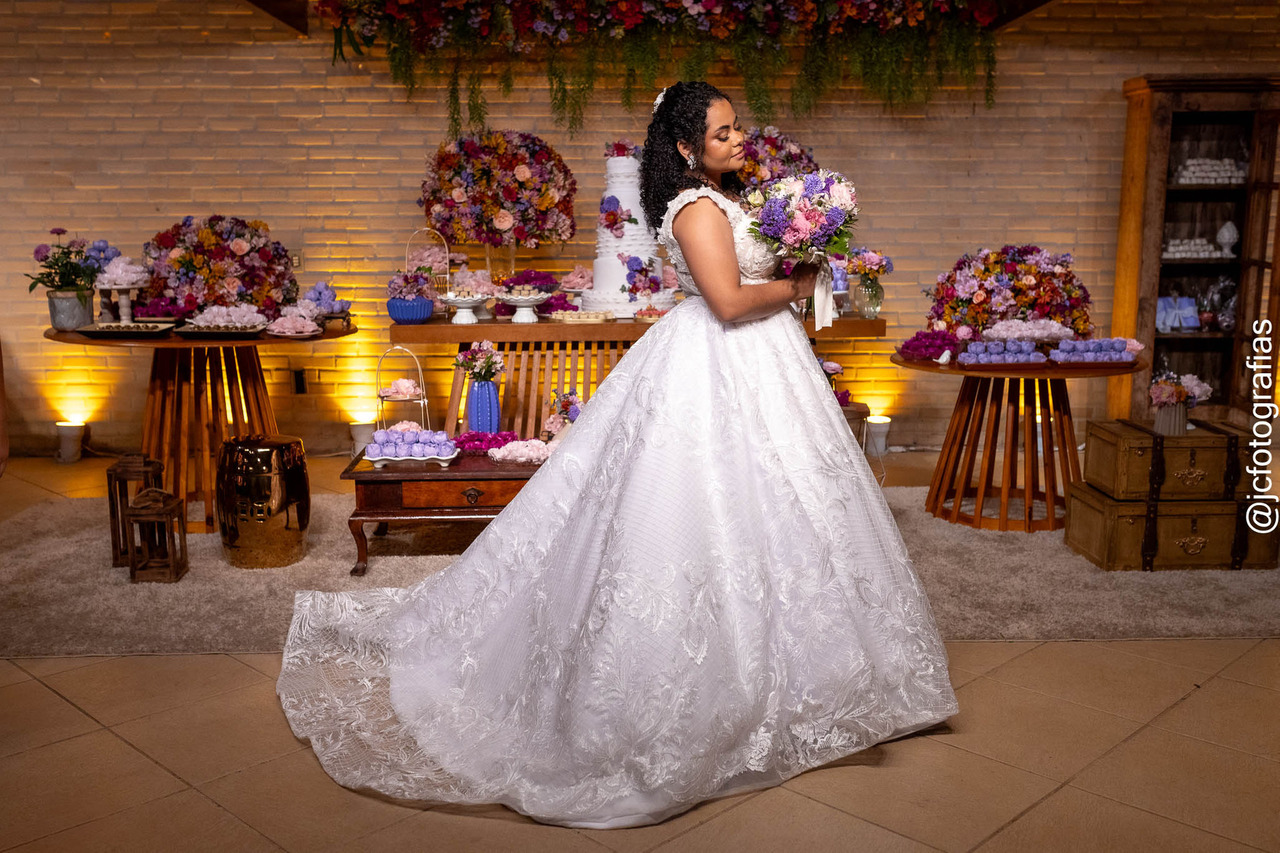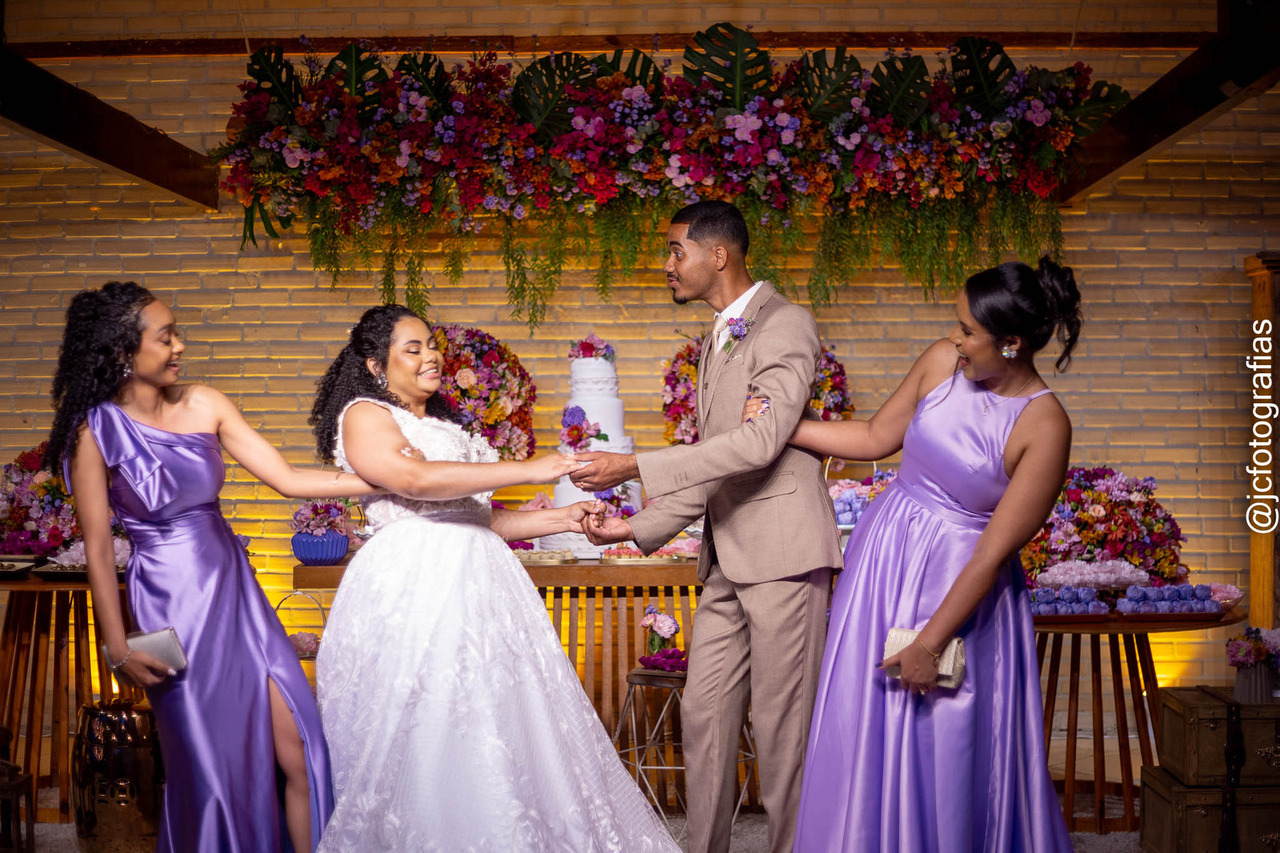 Em seguida, vieram as fotos junto à mesa de bolo e doces, e a tradicional “trend”, dinâmica para gerar interação entre noivos e convidados, unindo registros espontâneos e experiências inesquecíveis.
