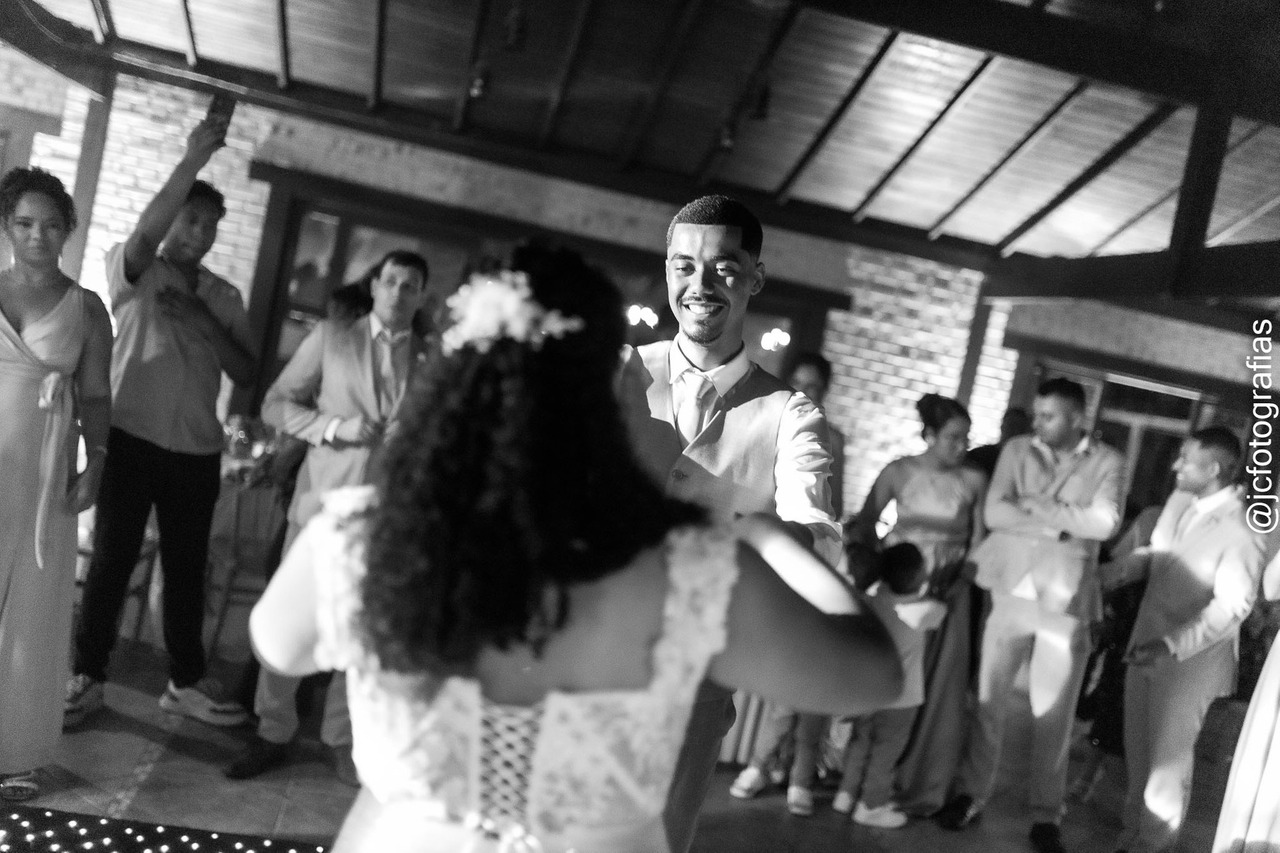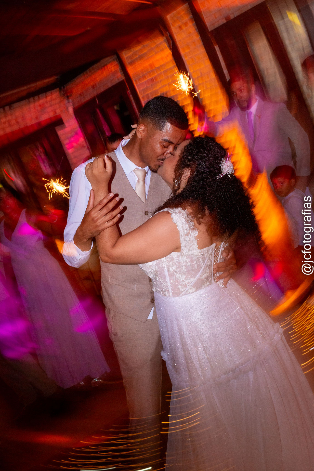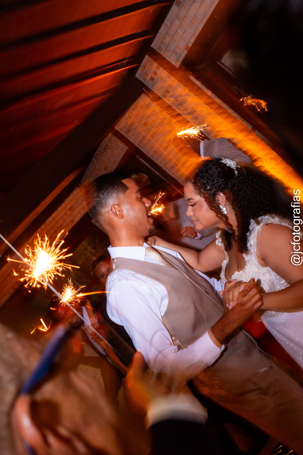 O casal abriu a pista de dança rodeado pelos padrinhos sob faíscas de sparkles, e a noite seguiu em clima de alegria e amor. A pista ficando mais quente, com a animação dos familiares, convidados e o próprio noivo que mandou vários passinhos, conduzidos por uma boa playlist montada por eles e executada com excelência pelo Dj da equipe ProArt Macaé.