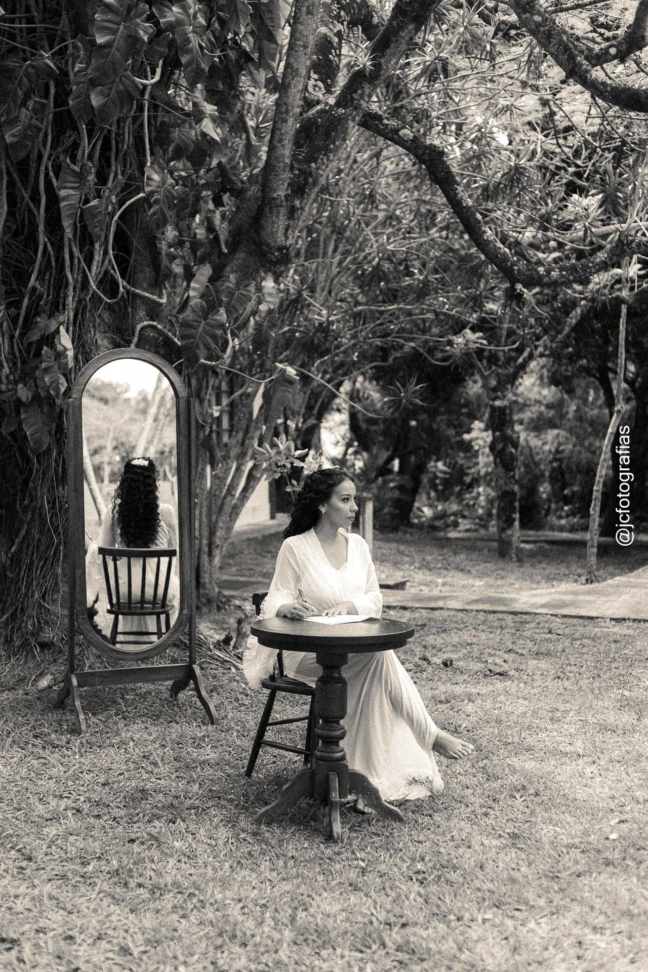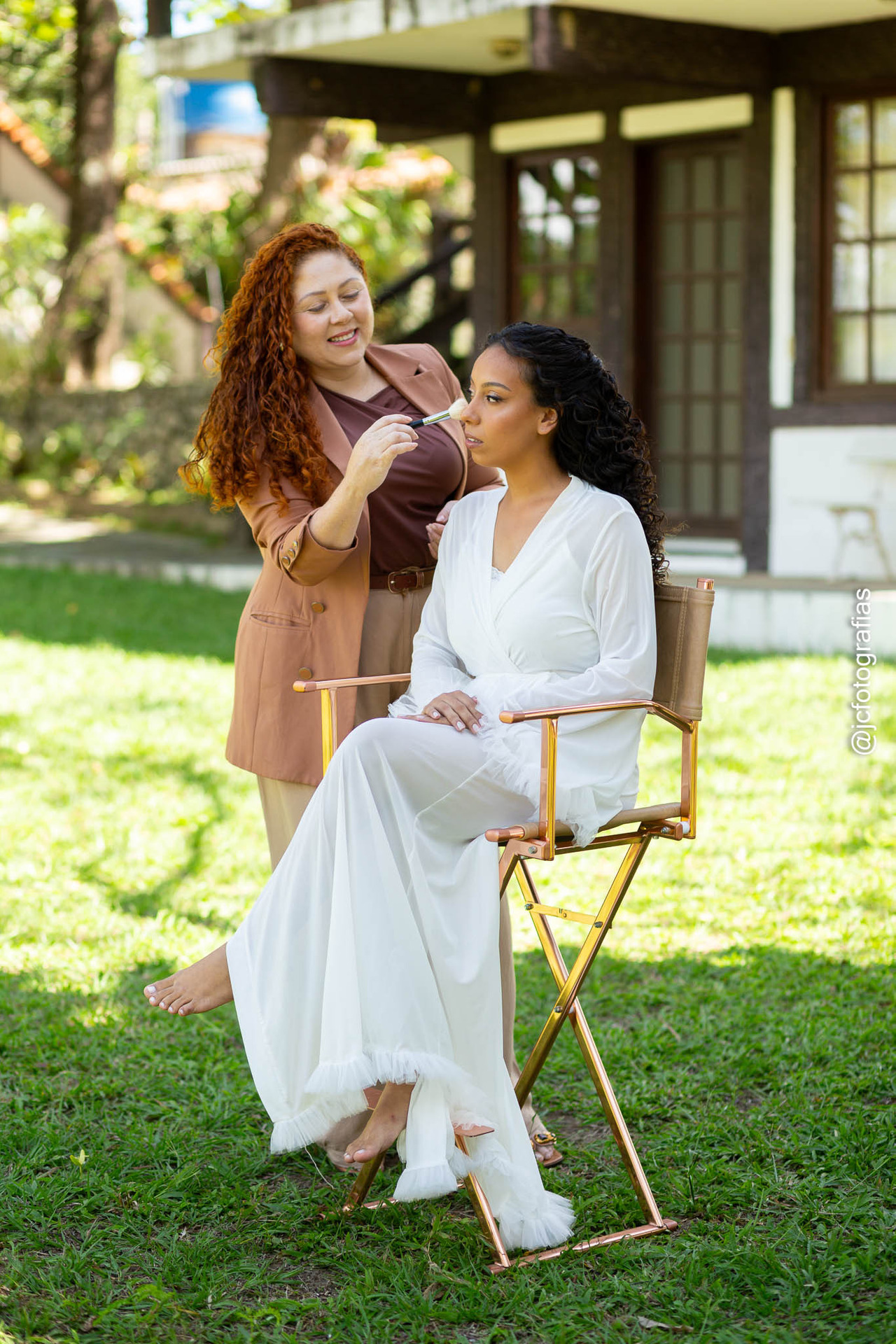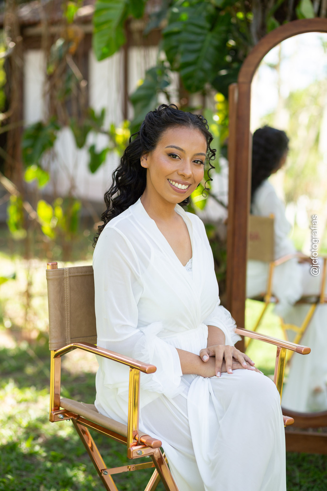 Para valorizar ainda mais as escolhas da noiva, descemos parte da mobília e a cadeira da maquiadora para o ambiente externo, aproveitando a luz natural e compondo uma cena leve, clássica e autêntica, exatamente como a Kethreen sonhou.