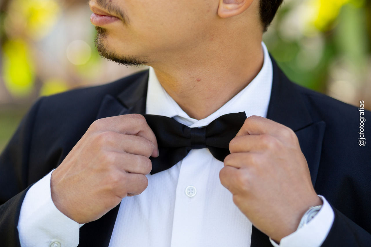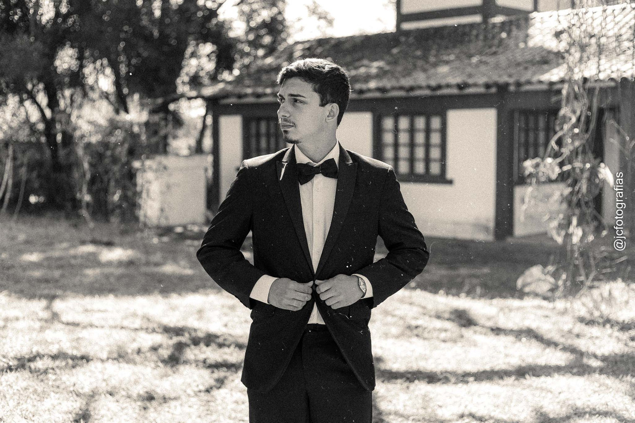 Enquanto isso, Gabriel se preparava no térreo do chalé, acompanhado do sogro e de um padrinho. Clássico e sofisticado, ele escolheu um traje preto com gravata borboleta, relógio e sapatos impecáveis, um visual atemporal que harmonizava perfeitamente com o estilo da noiva.