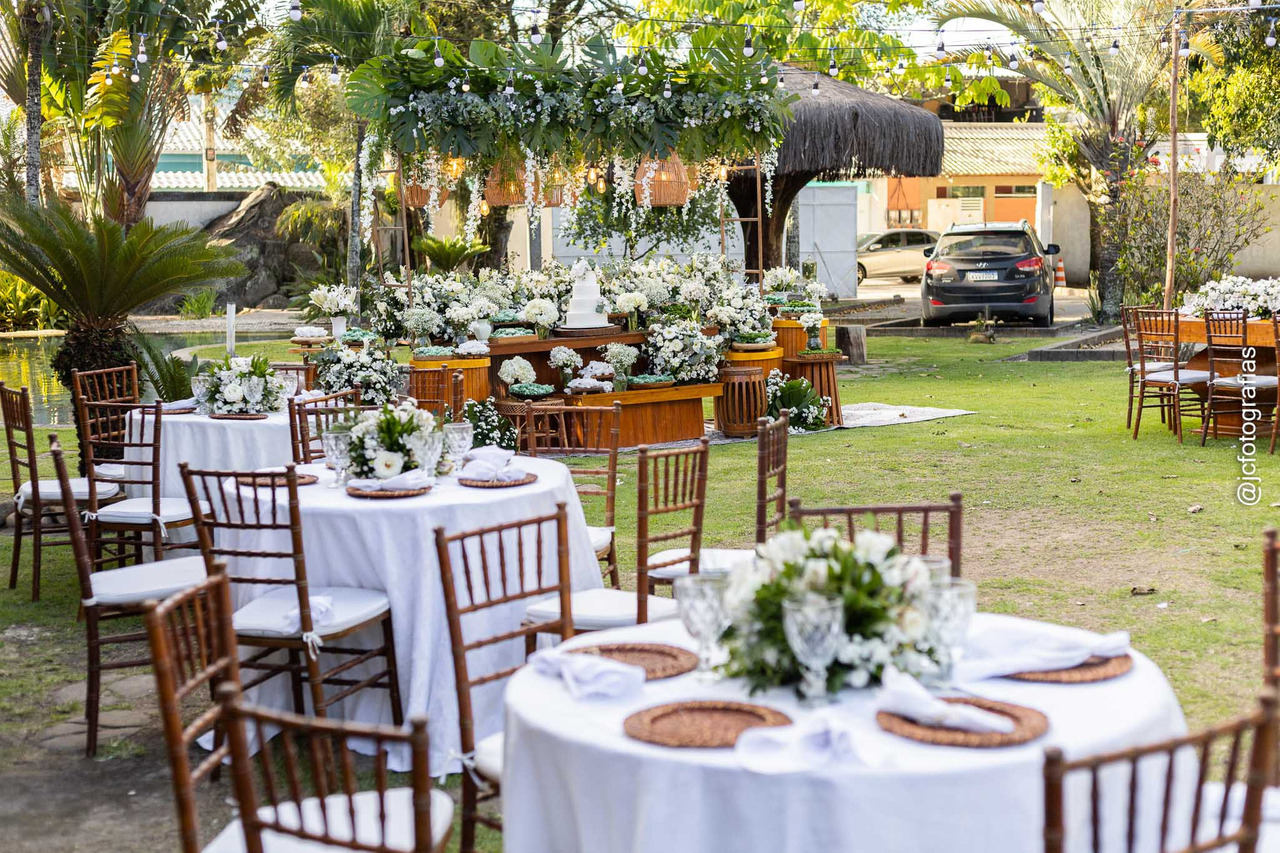 Seguimos para o Espaço Boa Vista, cenário da cerimônia e da recepção. A decoração, cuidadosamente pensada pela noiva, unia o branco e o verde natural uma combinação que nunca sai de moda e que traduz elegância e pureza.