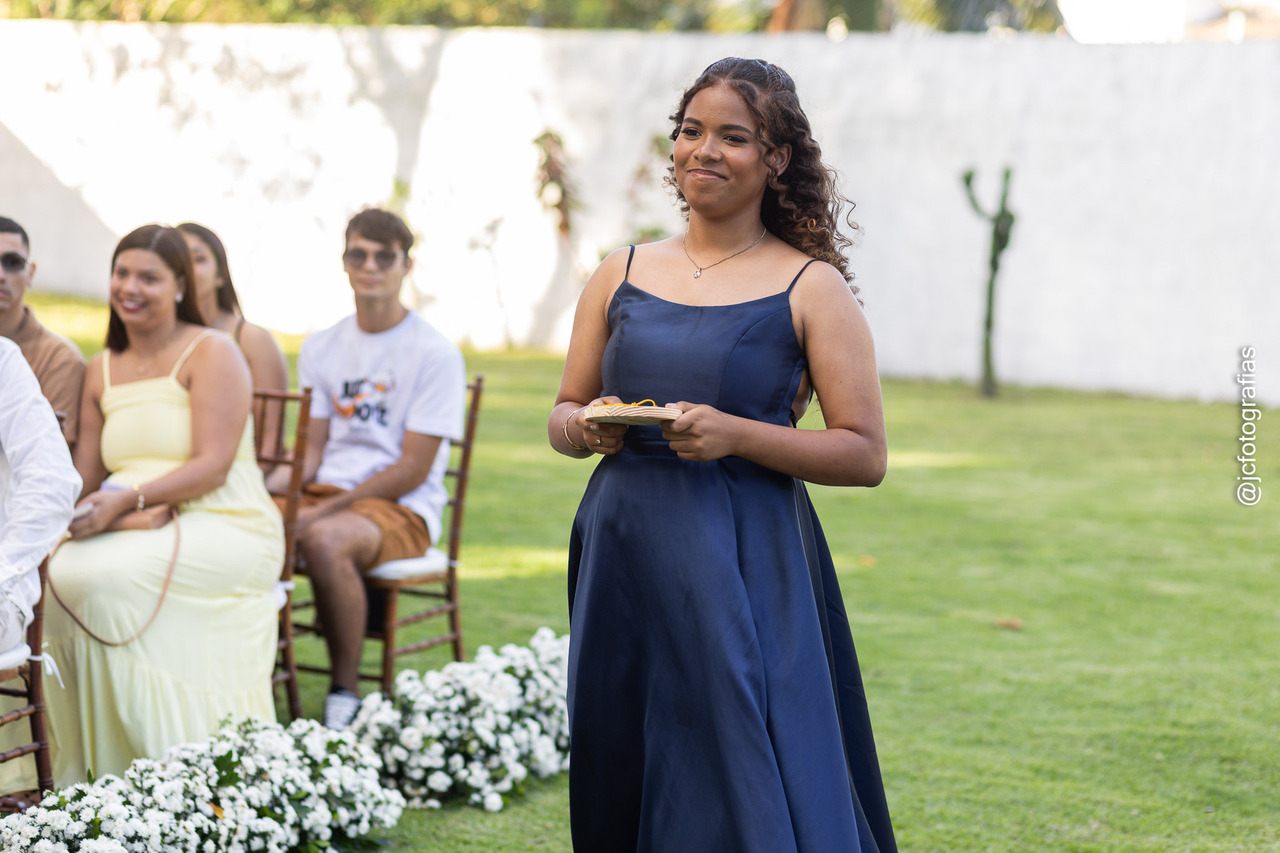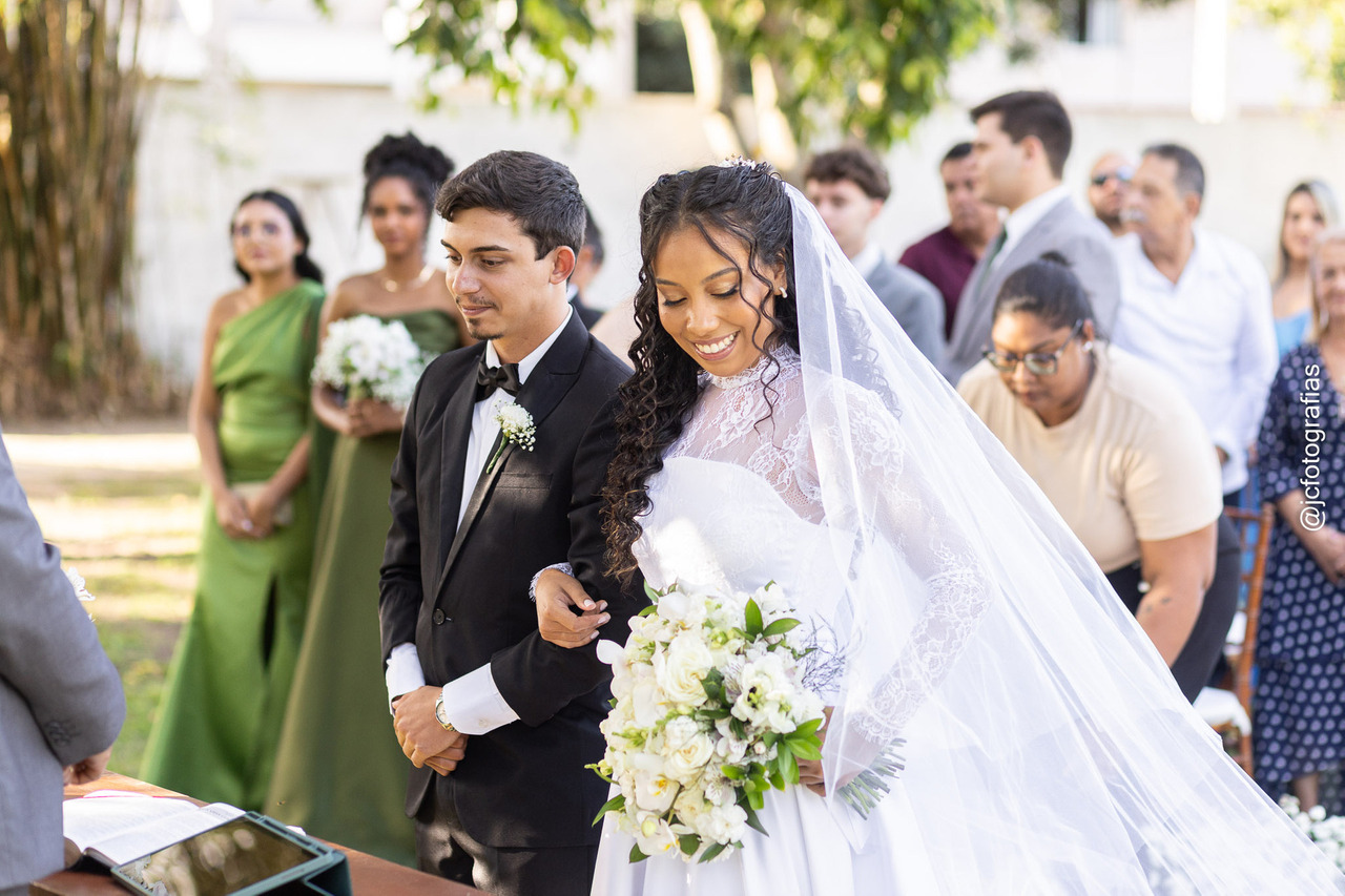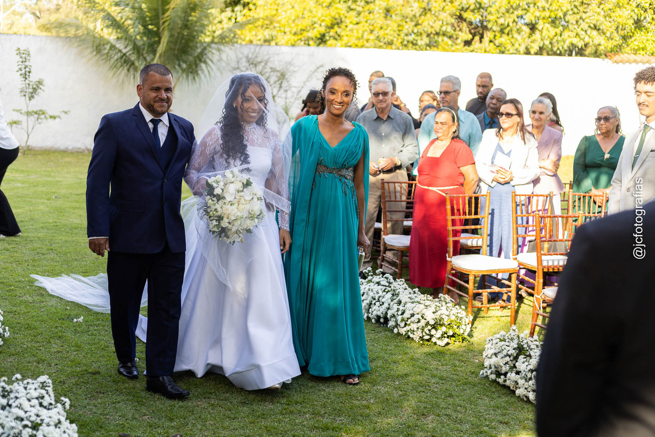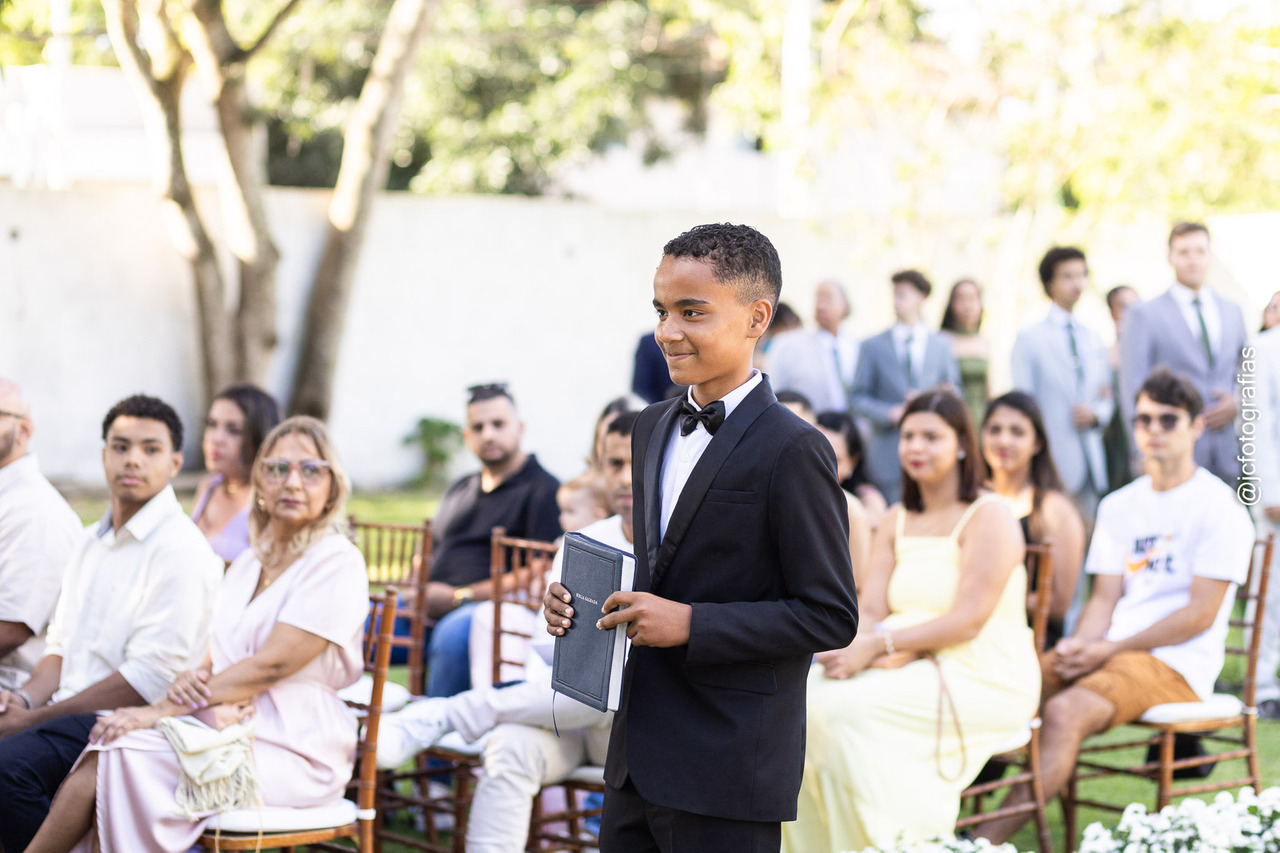 A cerimônia começou com a entrada da Bíblia, conduzida pelo irmão da noiva, marcando a celebração. Em seguida, vieram o noivo, acompanhado da mãe, os padrinhos, madrinhas, até que, por fim,