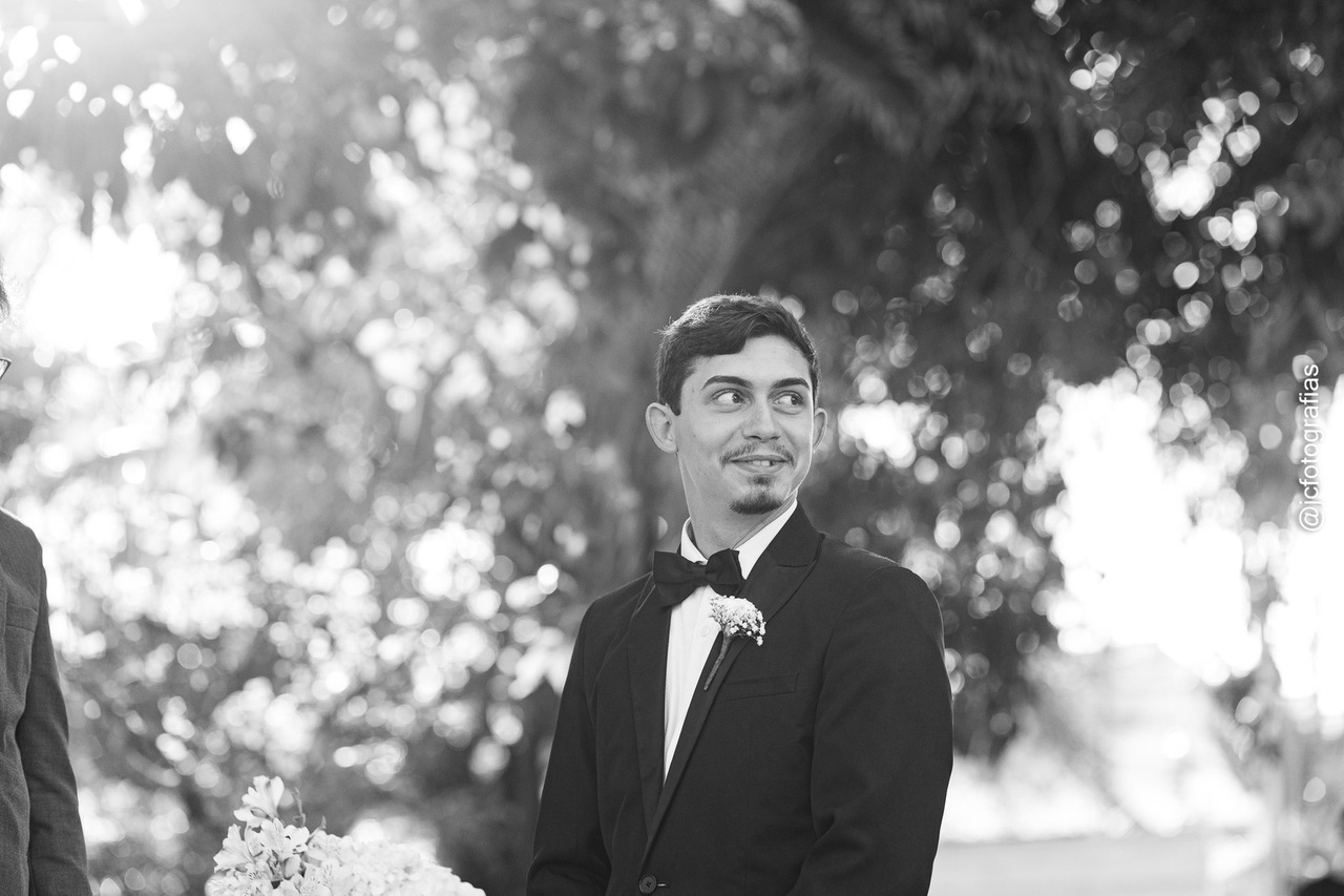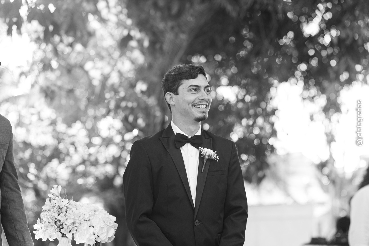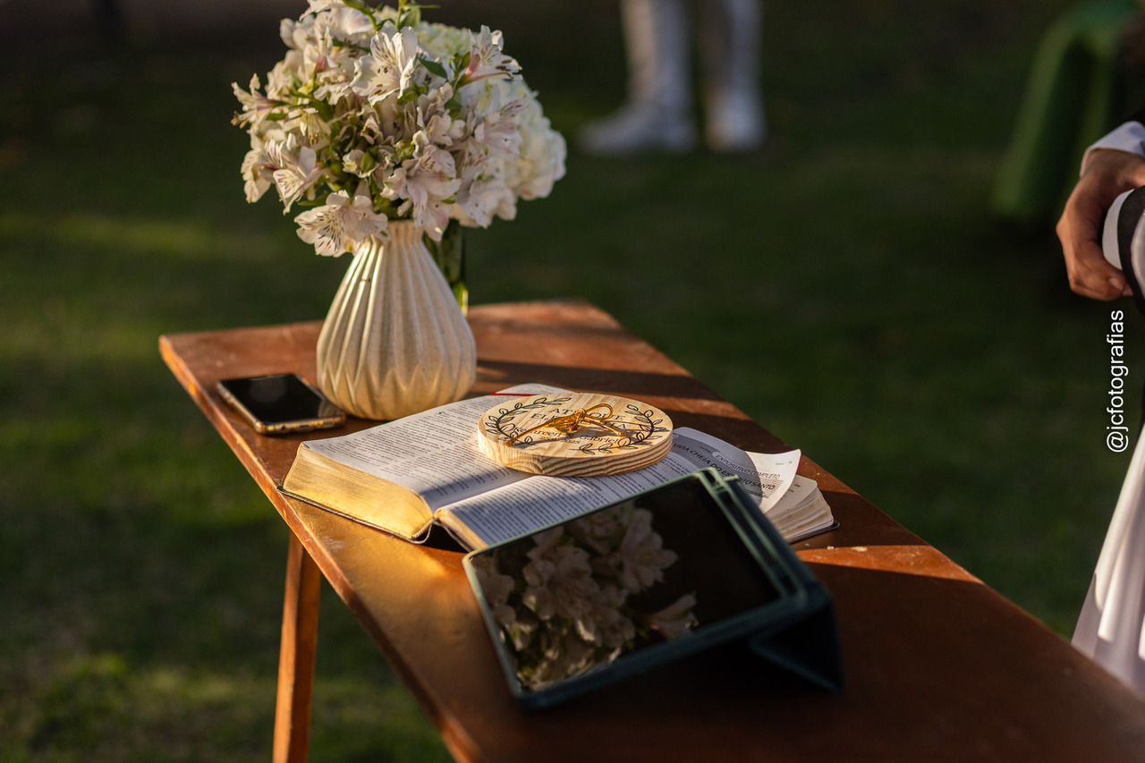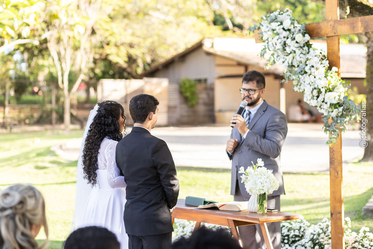 A cerimônia começou com a entrada da Bíblia, conduzida pelo irmão da noiva, marcando a celebração. Em seguida, vieram o noivo, acompanhado da mãe, os padrinhos, madrinhas, até que, por fim,