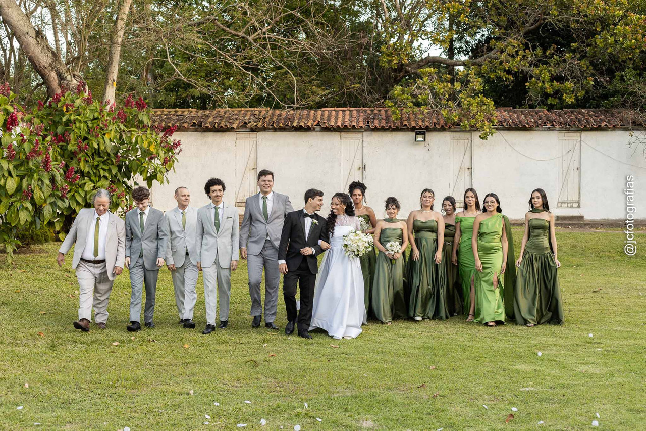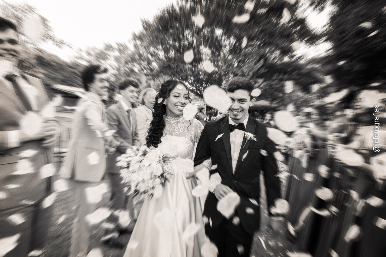 e uma saída triunfal sob chuva de pétalas, cercados pelos pais, padrinhos e amigos mais próximos.
