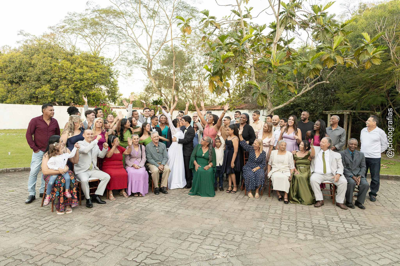 Em seguida, realizamos um grande desejo da noiva: uma foto com todos os 60 convidados, uma imagem que se tornou símbolo desse casamento e um marco afetuoso em nossa carreira.