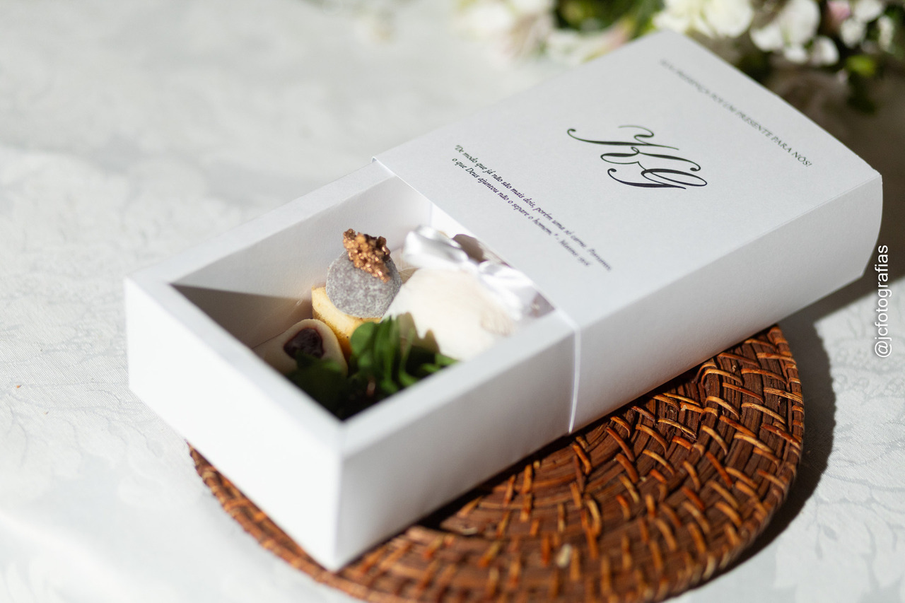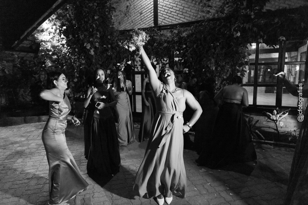 Vieram, então, os momentos divertidos: a jogada do buquê, a passagem da gravata e, na despedida, o toque final da noiva, um Flower Bar cuidadosamente preparado. Cada convidado recebeu um mini buquê de flores, uma caixinha personalizada com versículo bíblico e agradecimento, contendo bolo, bem-casado e docinhos. Um gesto doce e inesquecível, como tudo naquele dia.