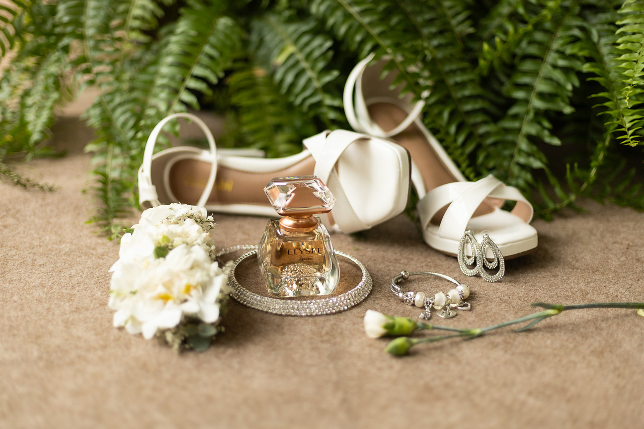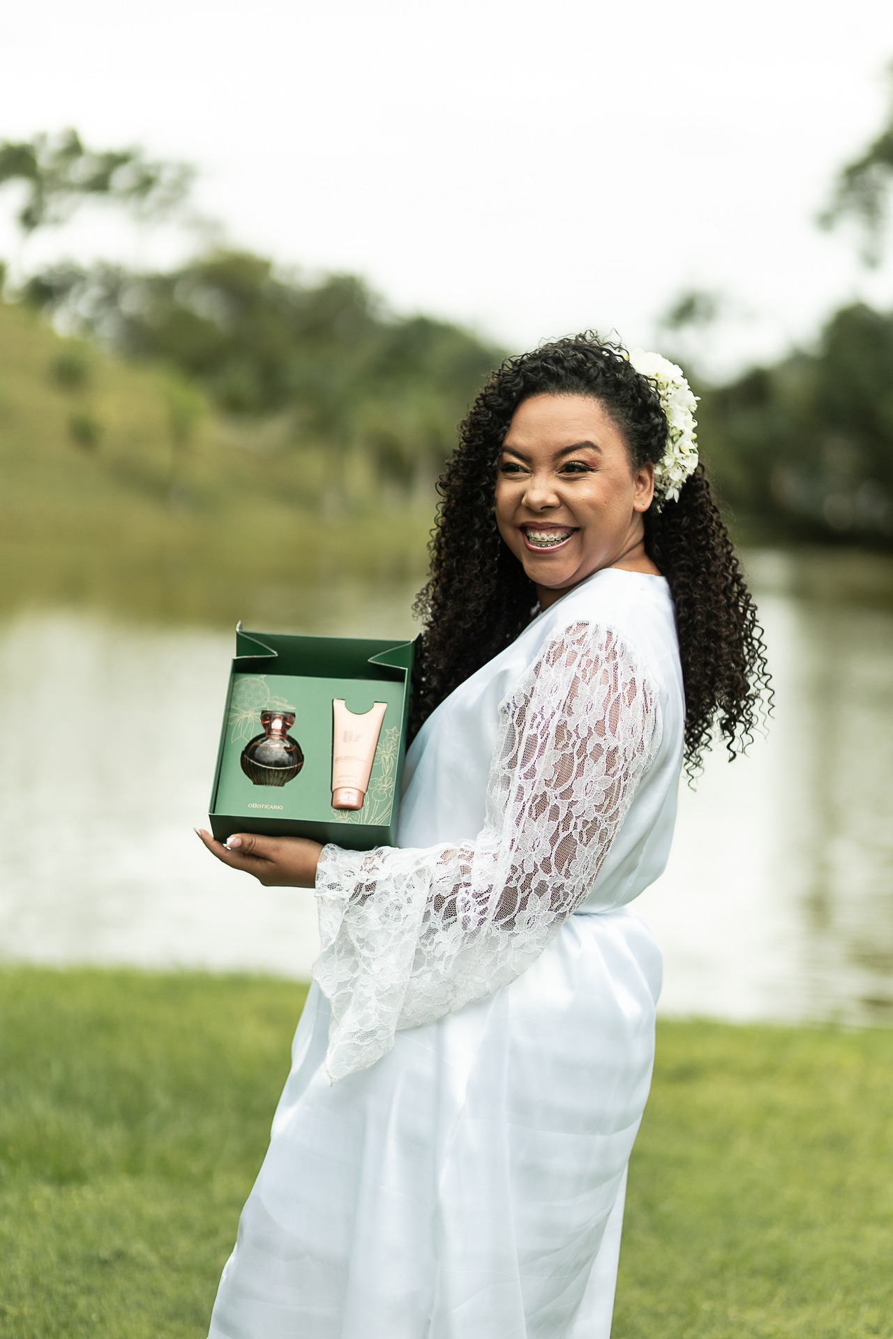 A Bruna estava acompanhada pela mãe e pela irmã, criando um clima íntimo, doce e cheio de risadas, como quem vive um momento esperado há muito tempo. Enquanto fotografávamos os acessórios da noiva joias, sapatos, bouquet e cada detalhe escolhido com tanto carinho um elemento especial se destacou: o perfume Boticário que ela usaria no dia.