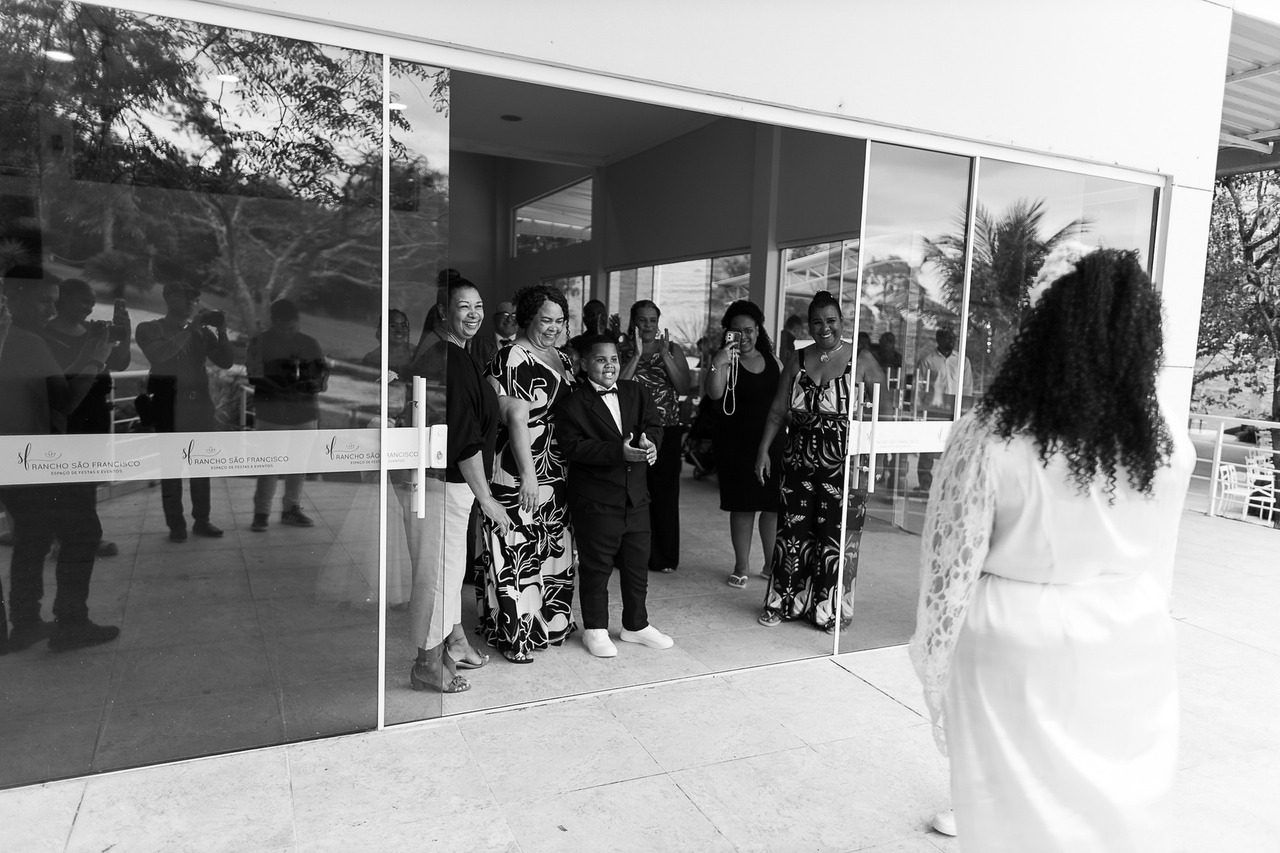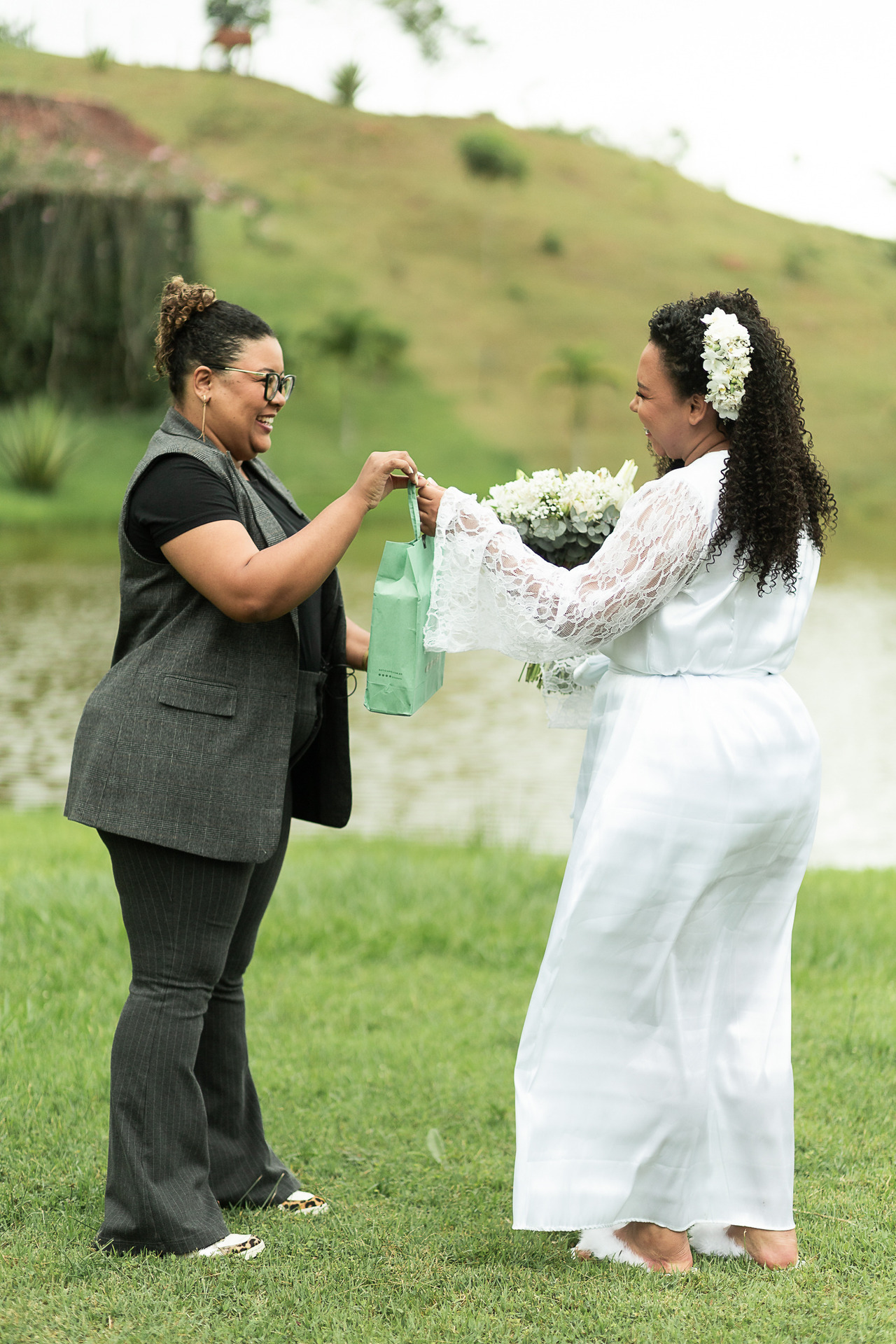 Antes de vestir o vestido, a Bruna deixou o quarto ainda de roupão, maquiagem pronta e acessório no cabelo para viver um dos momentos mais espontâneos da manhã: a reação da família que já aguardava na área externa. Risos, brilho no olhar, aquele clima de “está acontecendo”… e tudo banhado pela luz suave do espaço, que é amplo, iluminado e cercado por uma vista lindíssima perfeita para fotos atemporais.