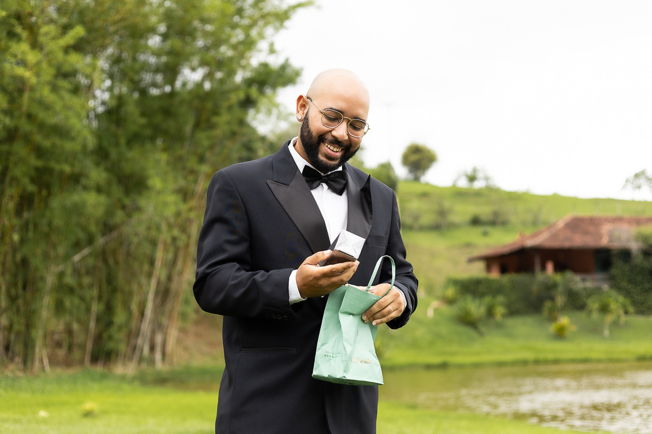 Ele estava lacrado, cuidadosamente guardado para esse instante, porque havia sido um presente do próprio Tiago. A emoção já começou ali. Logo depois, a Bruna recebeu mais um mimo do noivo: uma caixa da Boticário entregue no making of, arrancando aquele sorriso tímido e apaixonado que revela muito mais que palavras.