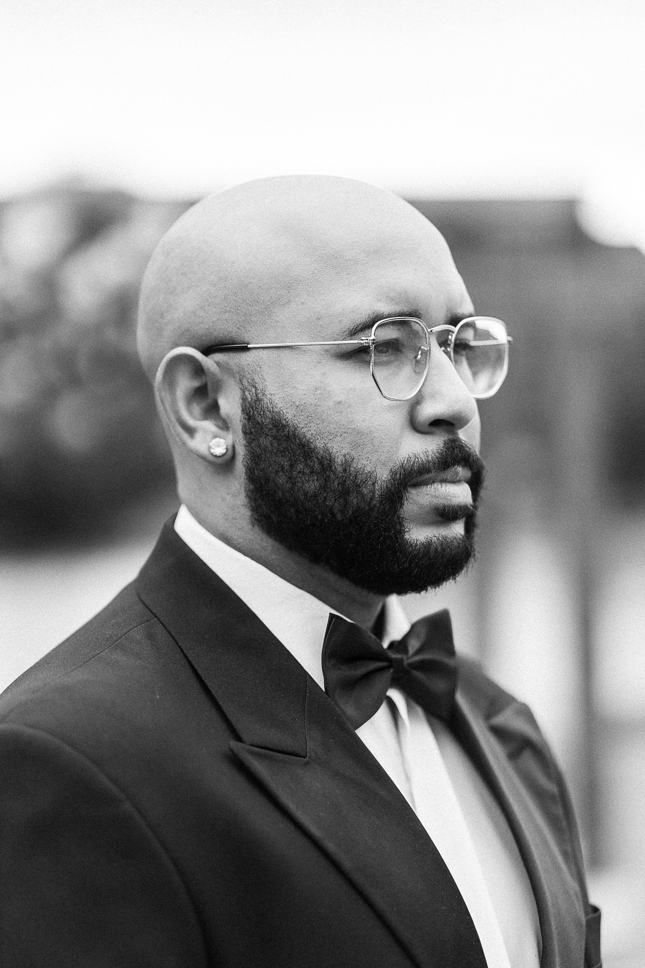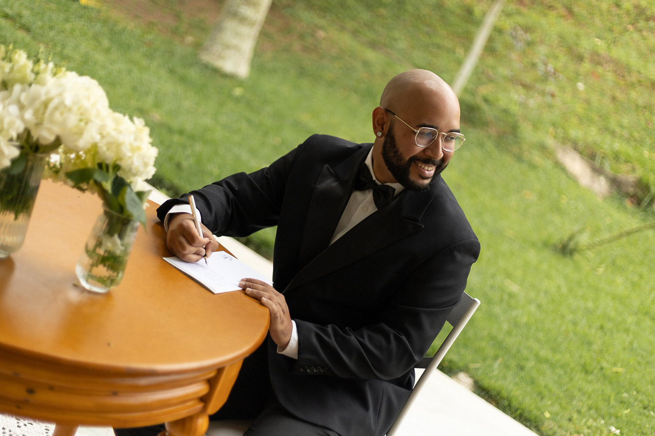 Enquanto trabalhávamos com a noiva, o Tiago chegou ao espaço já pronto, impecável no traje clássico com um toque de ousadia: gravata borboleta um detalhe de personalidade que marcou presença. Fizemos retratos dele, os detalhes do traje escolhido, e registramos aquele instante íntimo em que ele escrevia os votos, rodeado pela família.