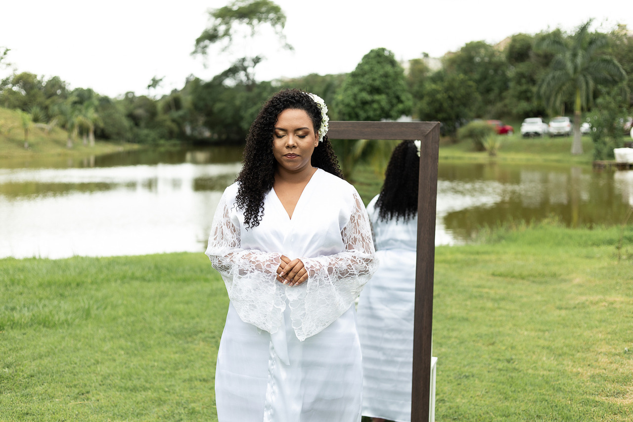 Registramos também retratos dela em roupão, diante do espelho, admirando-se e absorvendo cada segundo do início desse grande dia. Uma mistura de calma e ansiedade boa, que se traduz em fotos delicadas e profundas.