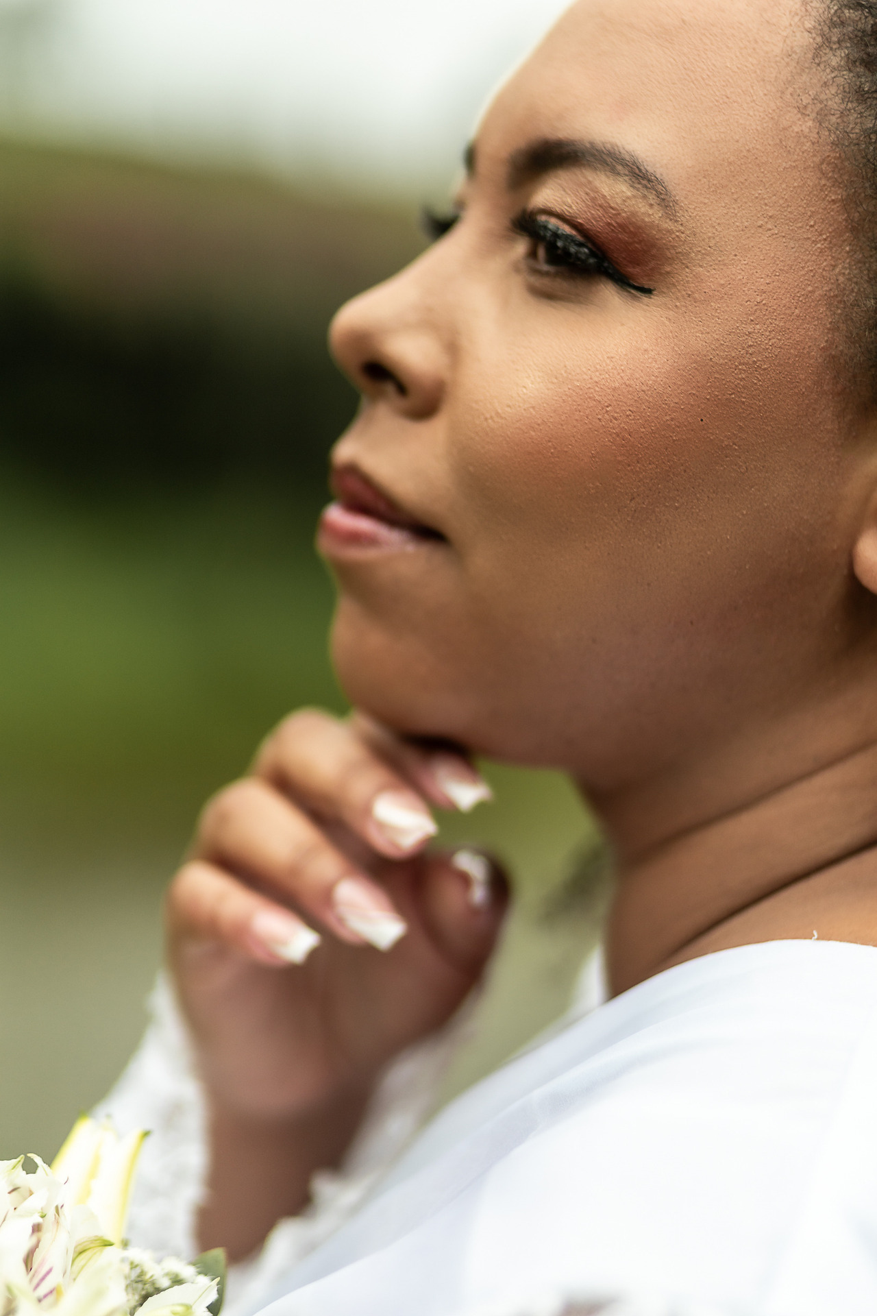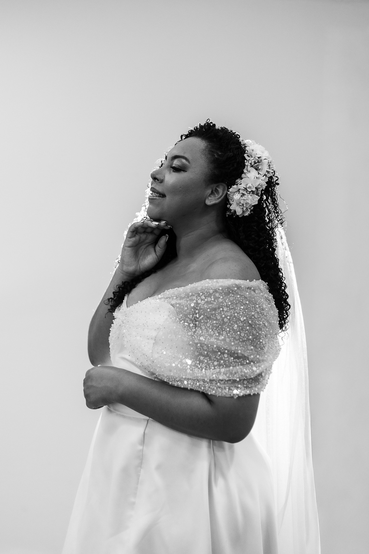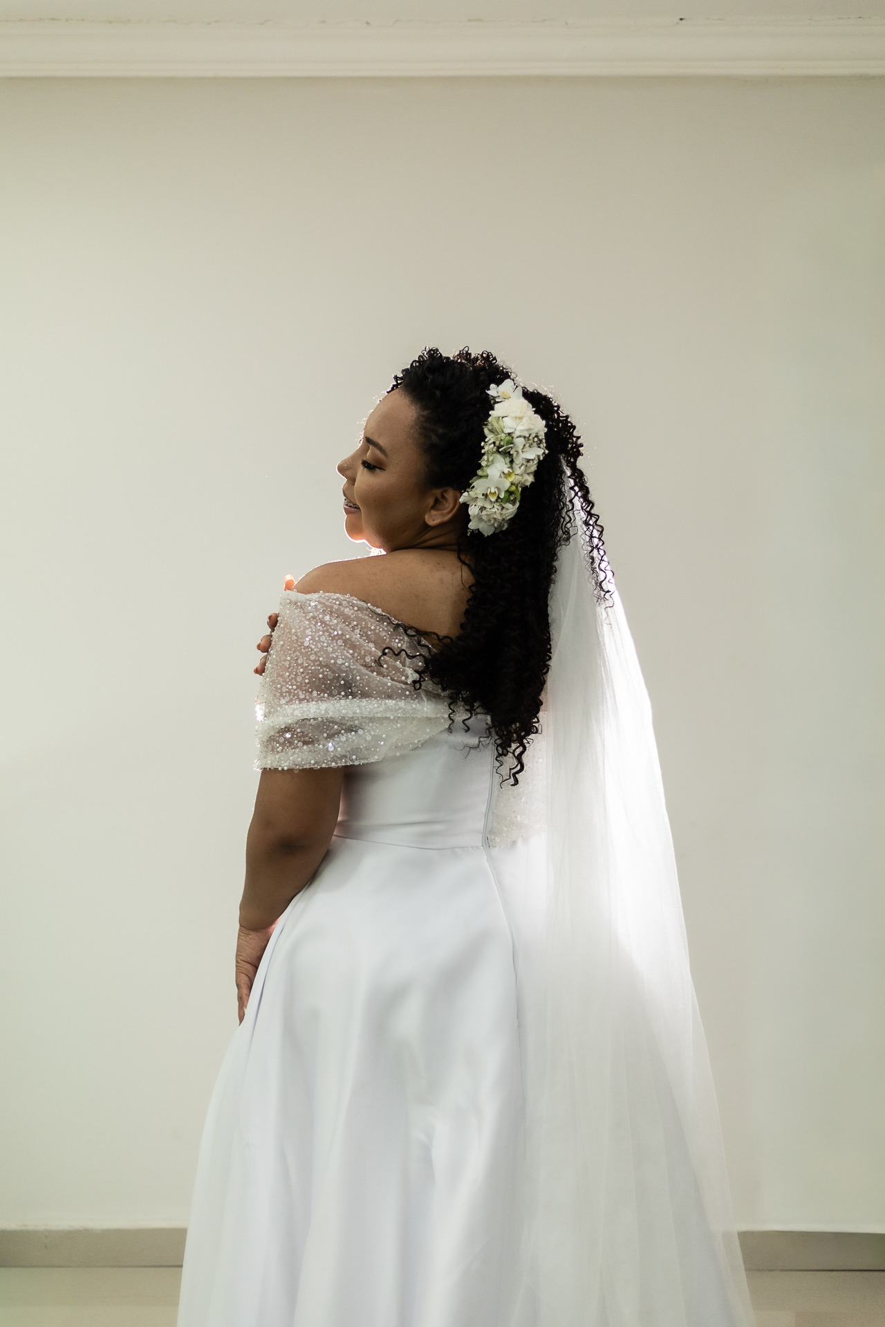 Fizemos retratos mais posados, elegantes, valorizando sua silhueta, o caimento do vestido e aquele brilho único que toda noiva carrega minutos antes de caminhar até o altar.