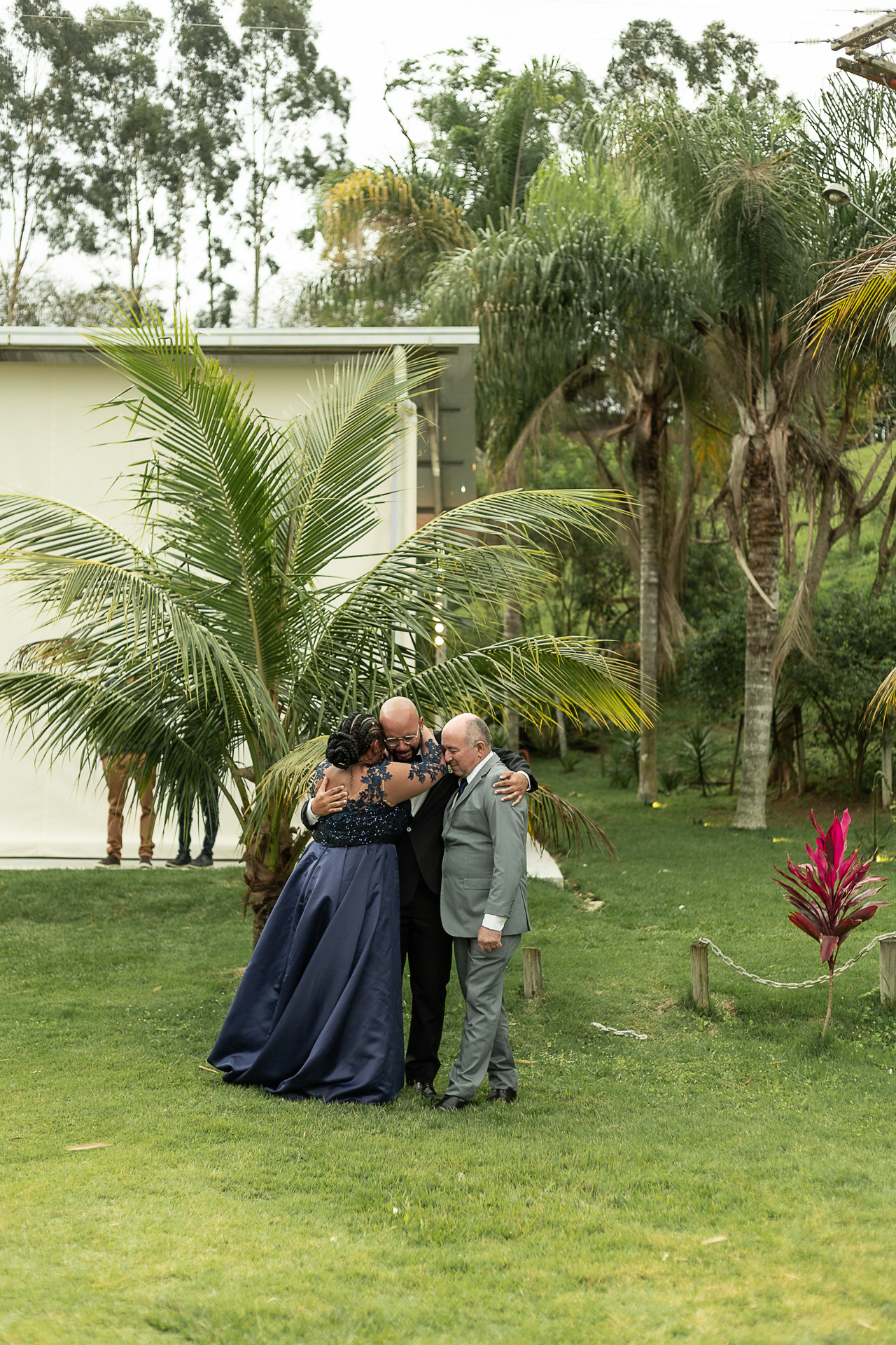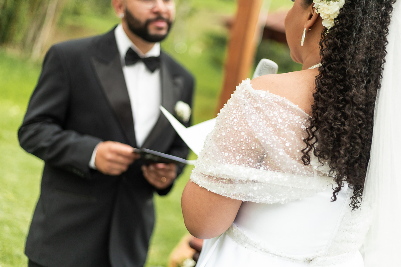 Após a troca das alianças, o plano inicial seria realizar ali mesmo a troca de votos. Mas a chuva apertou, pedindo uma mudança de direção. E foi perfeito assim: o casal optou por fazer os votos personalizados em um momento reservado, já após a cerimônia, quando poderiam se entregar totalmente às palavras que prepararam só os dois, sem interrupções, sem pressa, só a verdade deles.