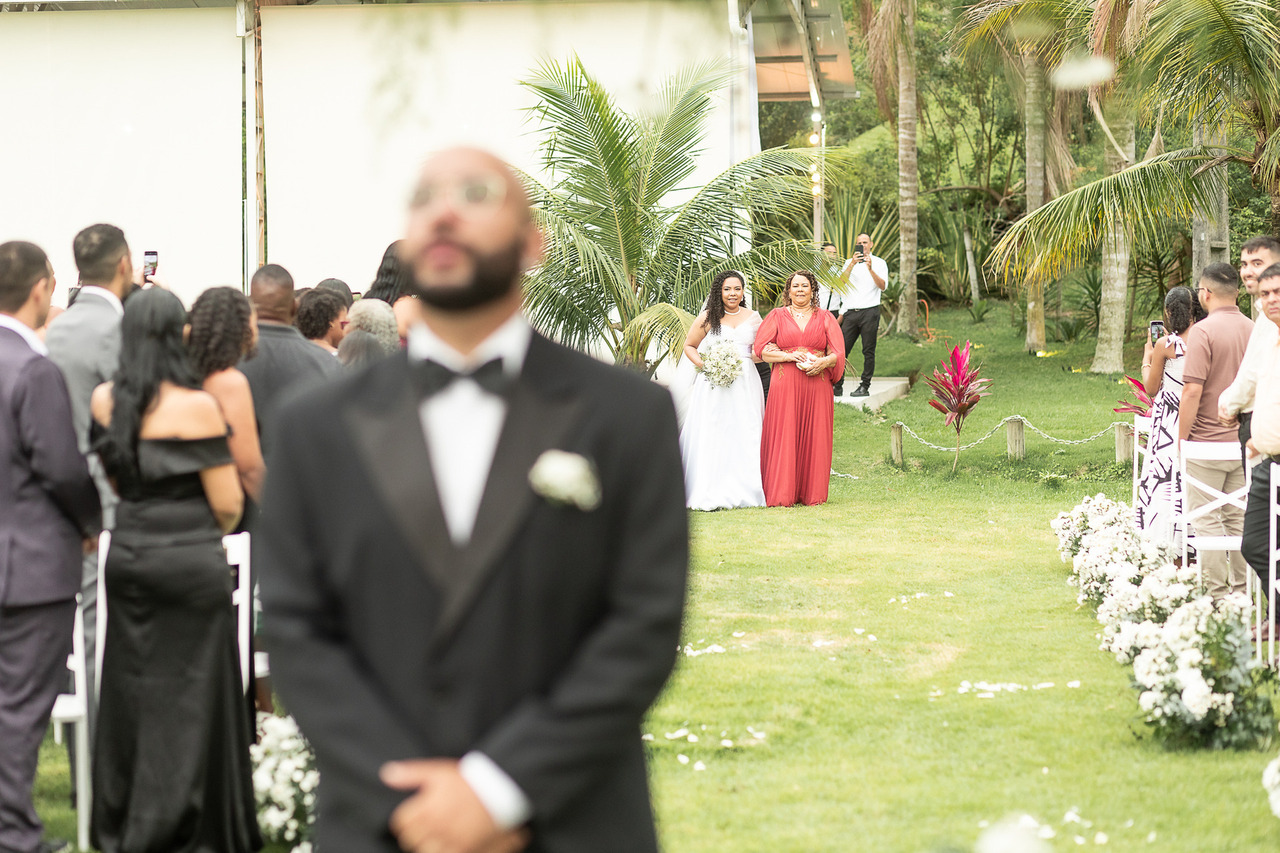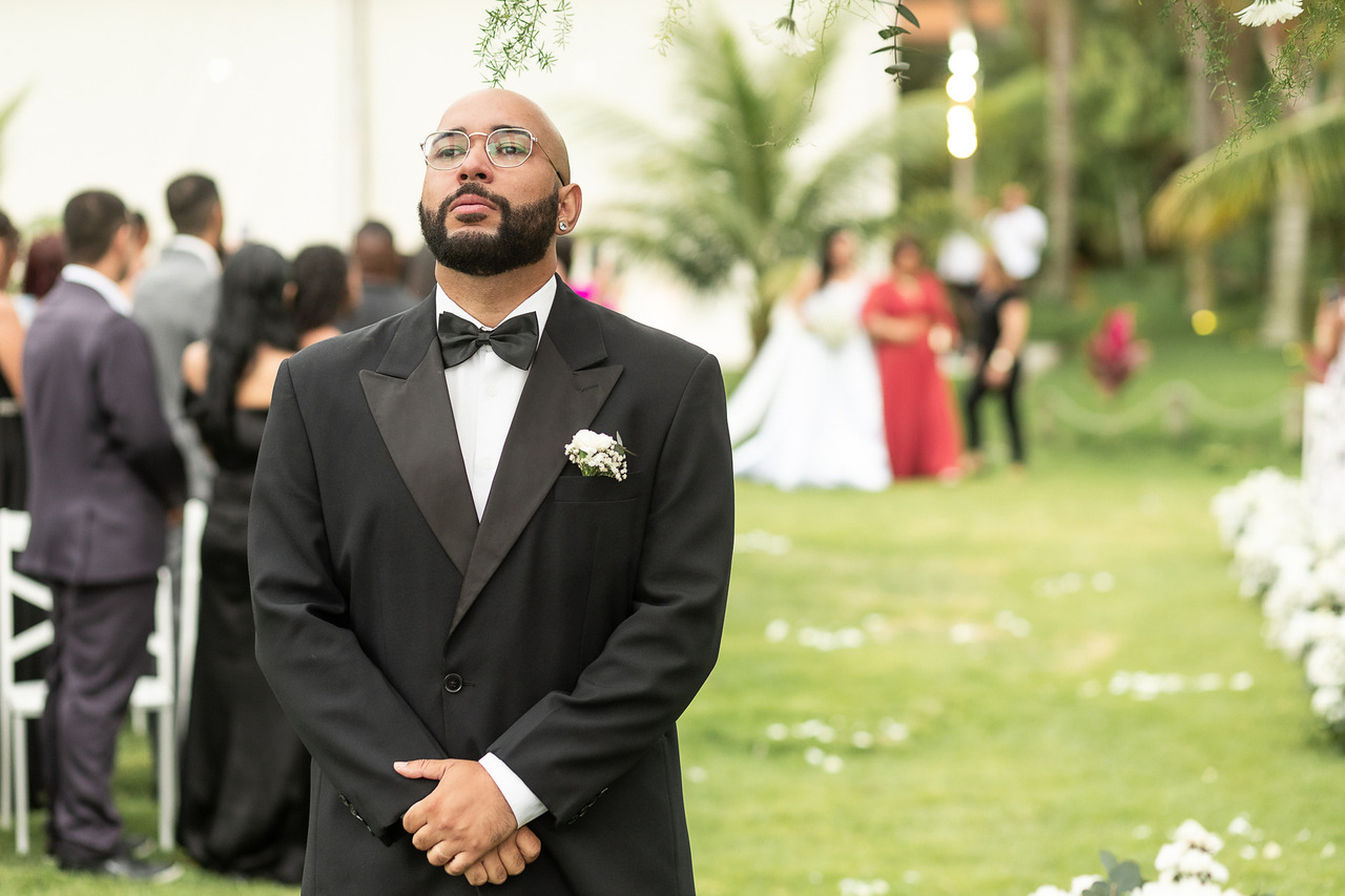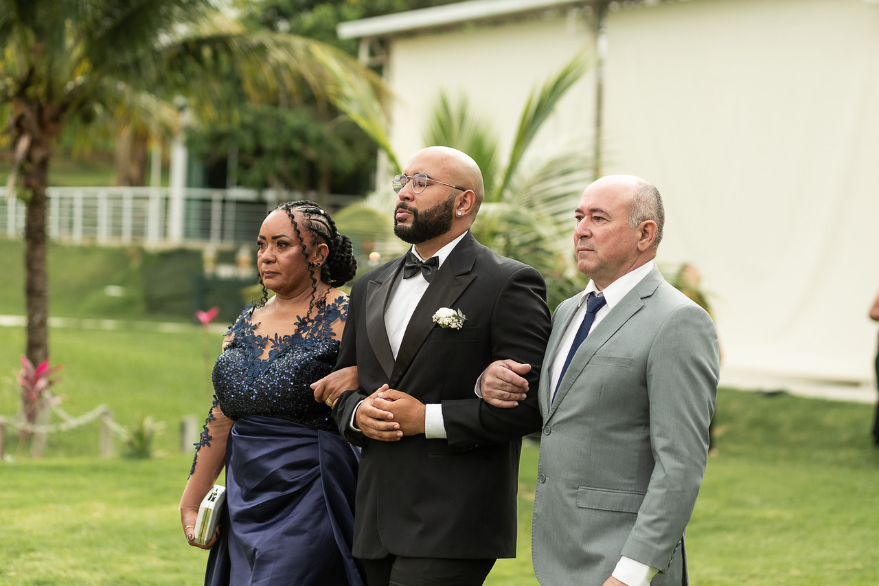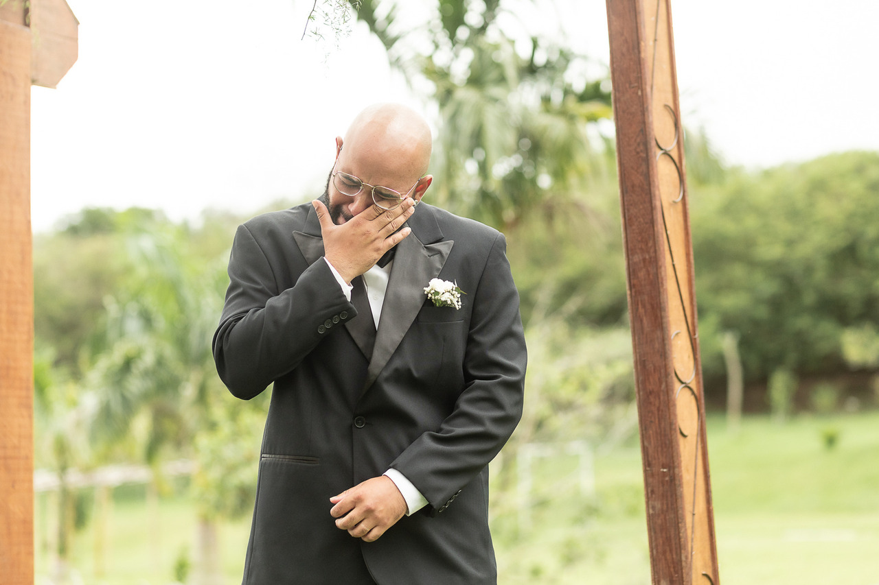O noivo entrou acompanhado da mãe e do pai, em um momento que já antecipava toda a carga emocional daquele grande dia. Assim que ele chegou ao altar, as lágrimas vieram sem esforço, como quem finalmente encontra o lugar onde sempre quis estar.