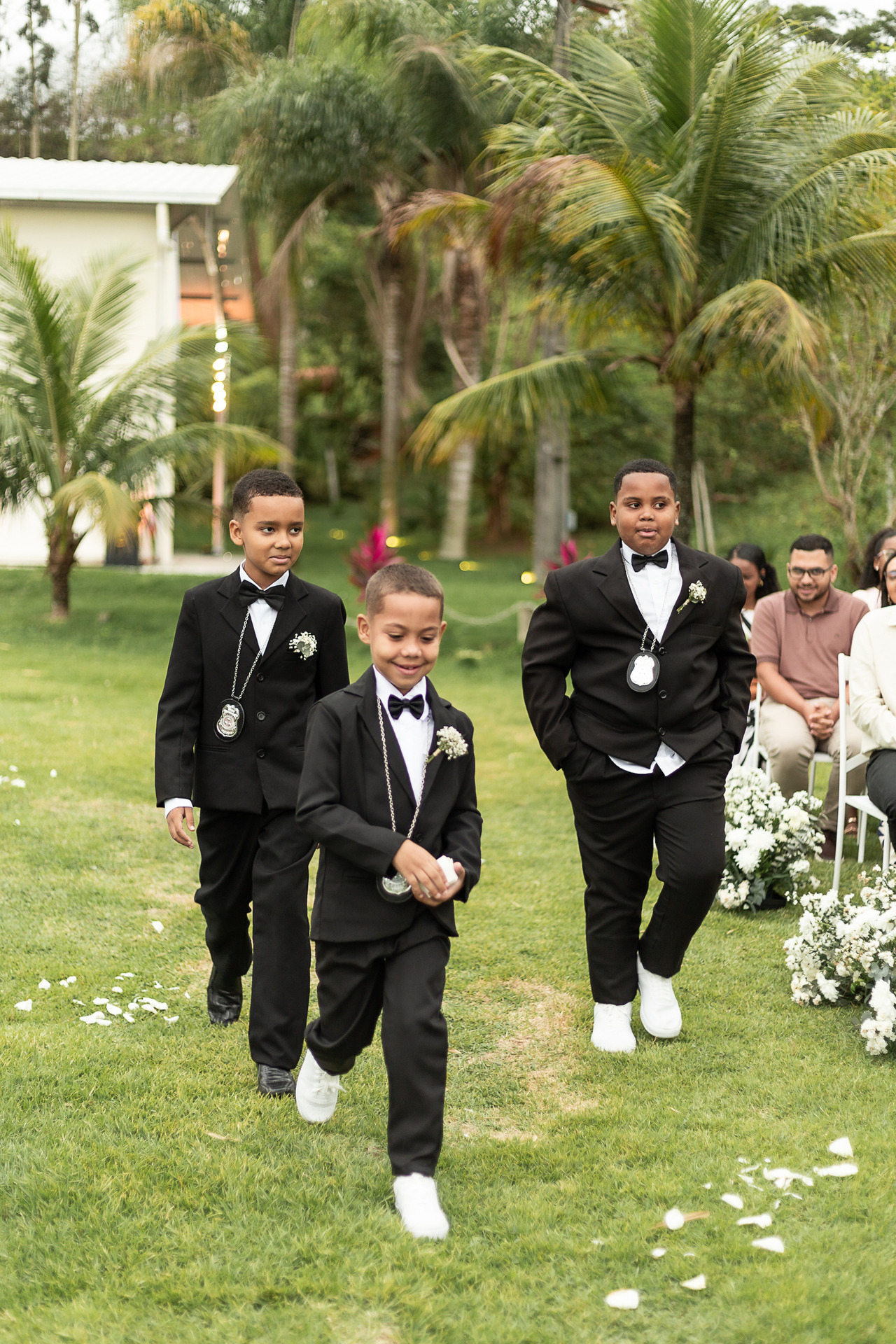 A cerimônia da Bruna e do Tiago começou com a delicadeza de um cortejo tradicional : crianças, padrinhos, madrinhas, cada um carregando um pouco da história do casal.