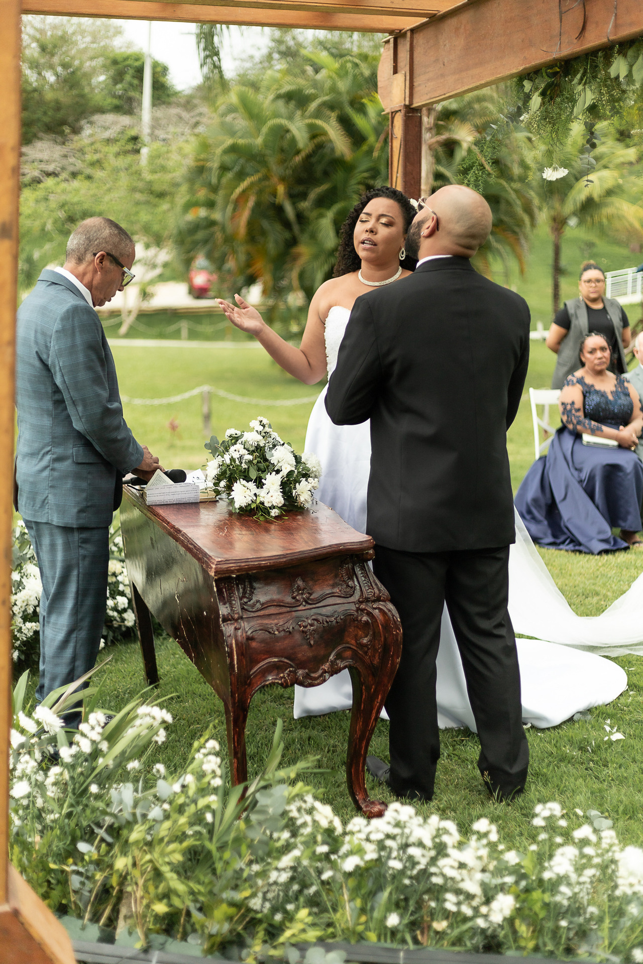 O pastor que celebrou o casamento compartilhou com todos os presentes o privilégio de estar ali. Inicialmente não seria ele o celebrante, mas por acompanhar de perto a trajetória da Bruna e do Tiago, estar ali se tornou um presente. Seu discurso foi íntimo, cheio de significado, refletindo tudo o que eles viveram até chegar ao tão esperado “sim”.