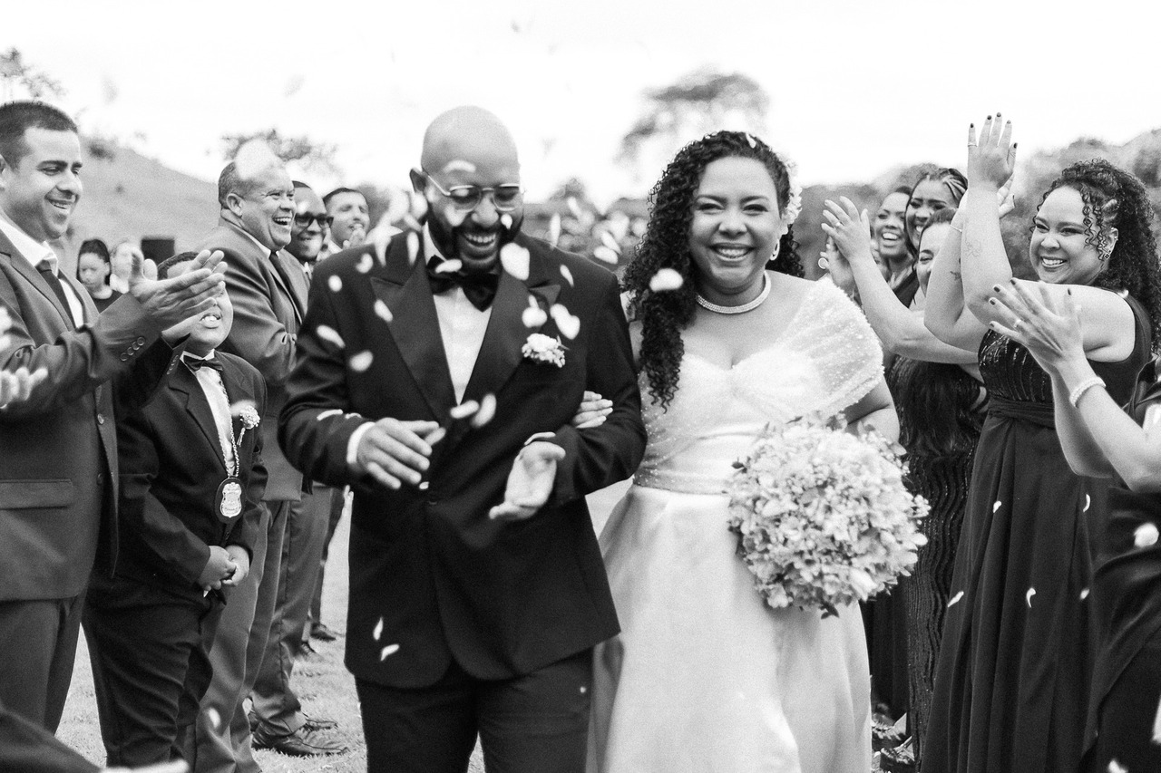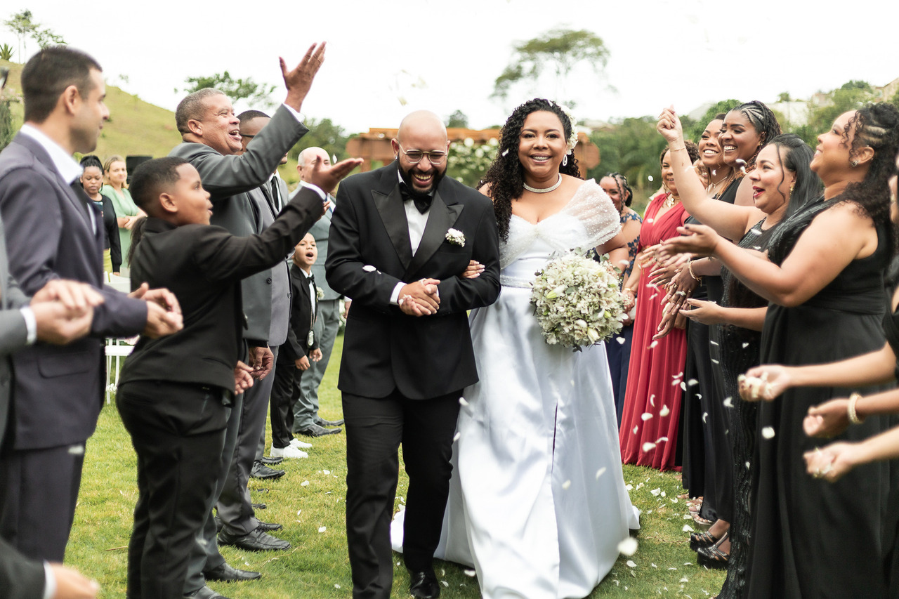 Para fechar a cerimônia com a delicadeza que ela merecia, a saída dos noivos foi marcada por uma chuva de pétalas. Mesmo sob a chuva fina do céu, as pétalas ao ar criaram um contraste lindo e leve.