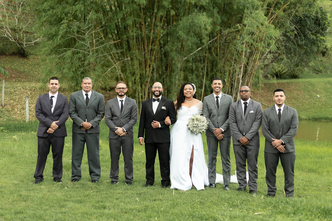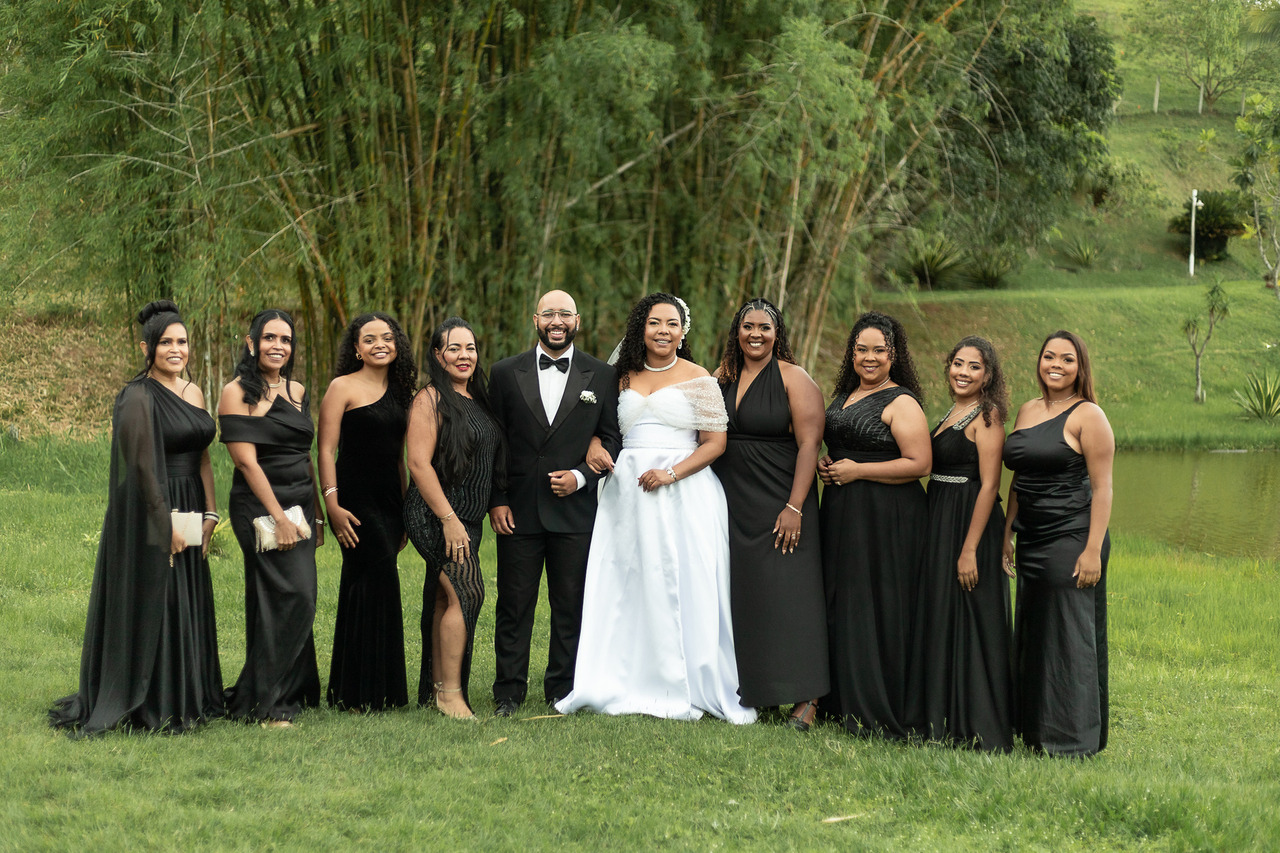 Depois da cerimônia, aproveitamos uma trégua da chuva para registrar alguns dos momentos mais divertidos do dia. Fizemos as fotos protocolares com padrinhos e madrinhas e, aliás, esse casamento marcou um detalhe especial para nós: foi a primeira vez que fotografamos madrinhas de preto. Um clássico contemporâneo que está em alta no universo dos casamentos, mas que ainda não tínhamos vivido de perto. Ficou simplesmente elegante.