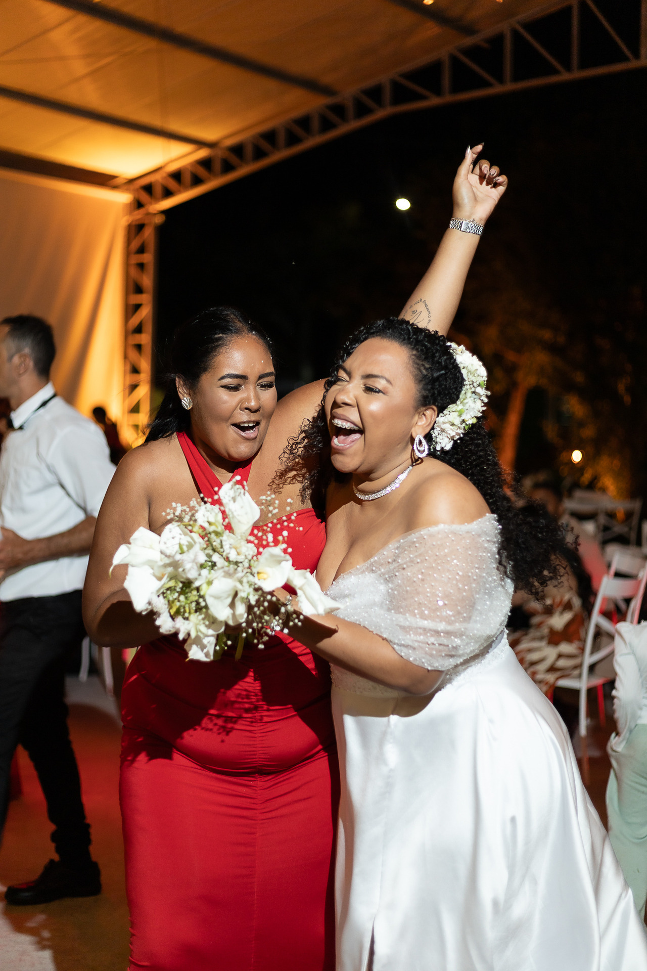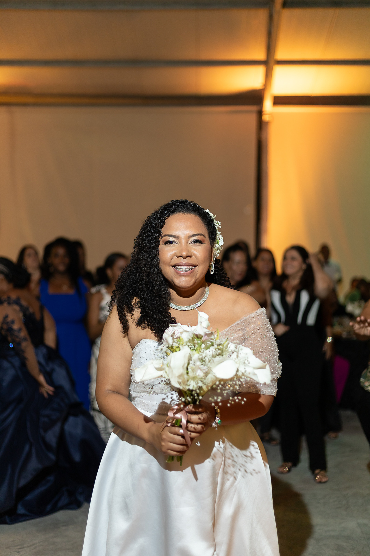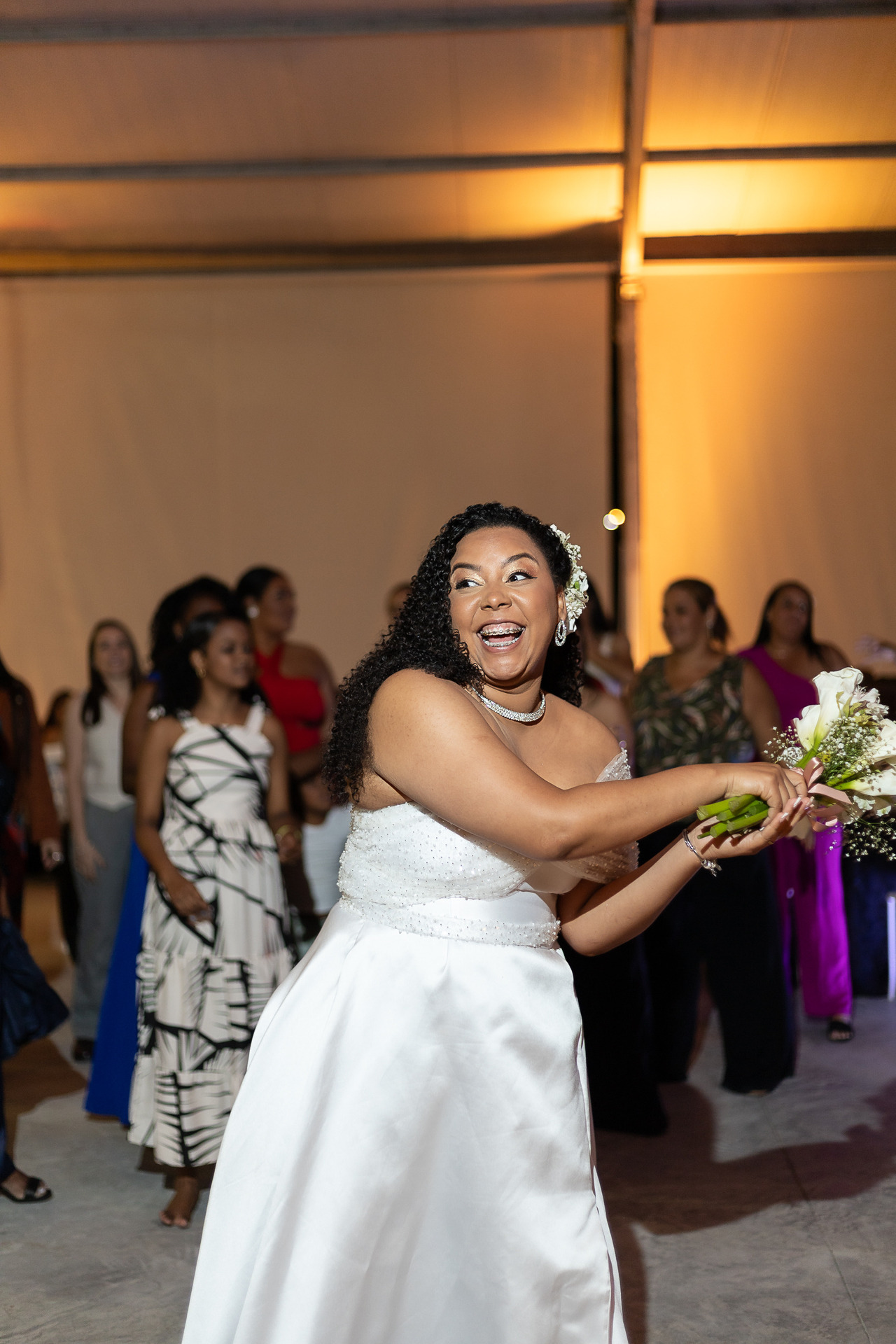 A pista seguiu animada até o último protocolo da noite: o momento do buquê, sempre aguardado e cheio de expectativa. A Bruna encerrou essa parte com a mesma leveza que carregou o dia inteiro.