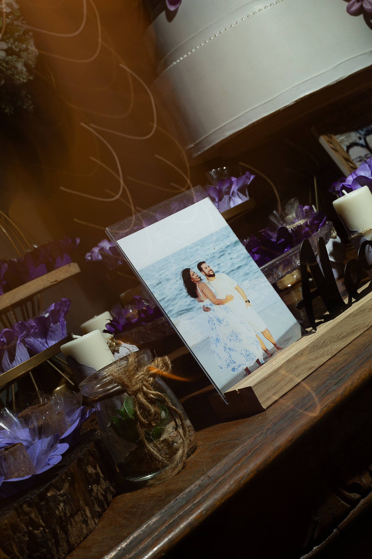 Fotografias de momentos importantes do casal fazia parte da decoração e composição afetiva da mesa.