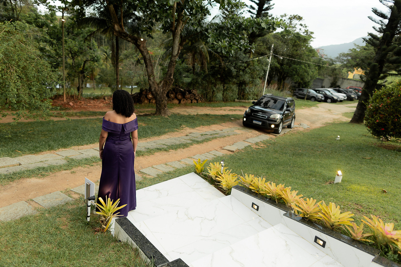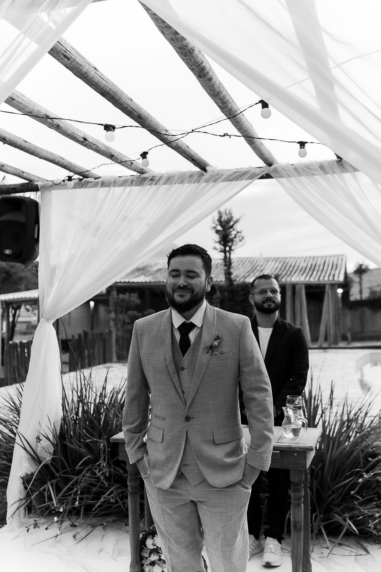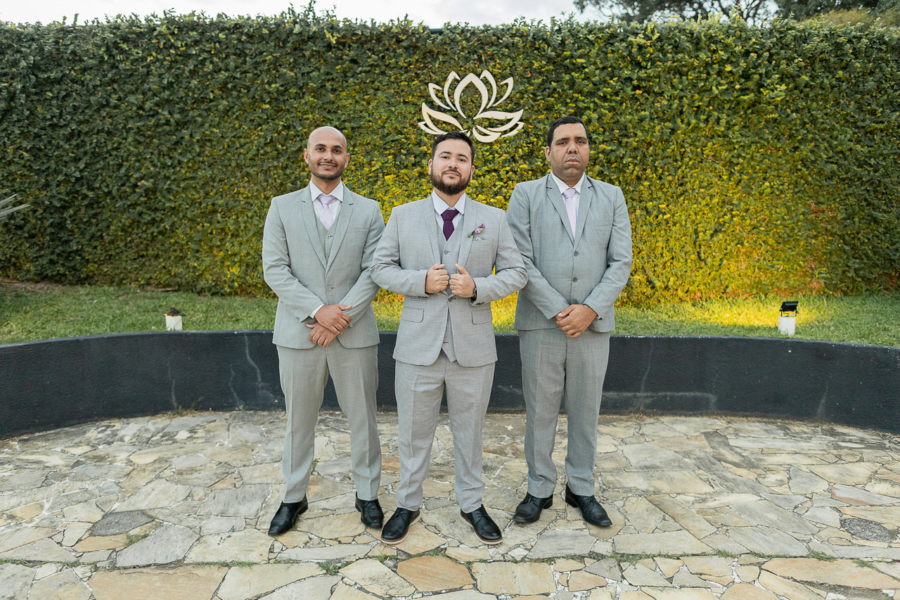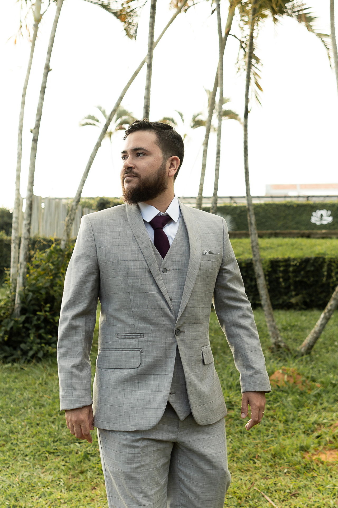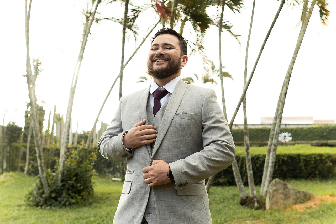 O noivo Rafael também foi fotografado na área externa do espaço, valorizando o verde do ambiente e os detalhes do traje.