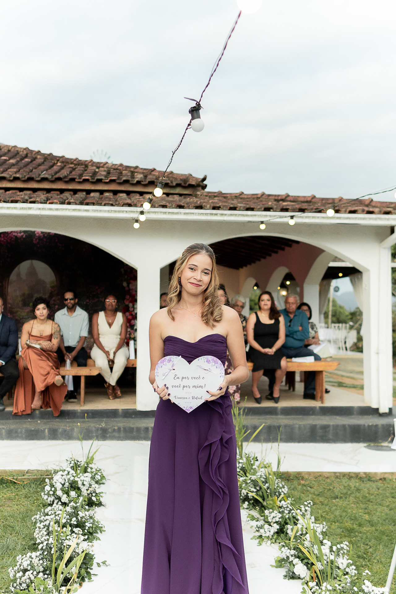 Outro destaque foi a entrada das alianças, feita por uma pessoa adulta, com uma plaquinha especial, fugindo do convencional e expressando a personalidade do casal.