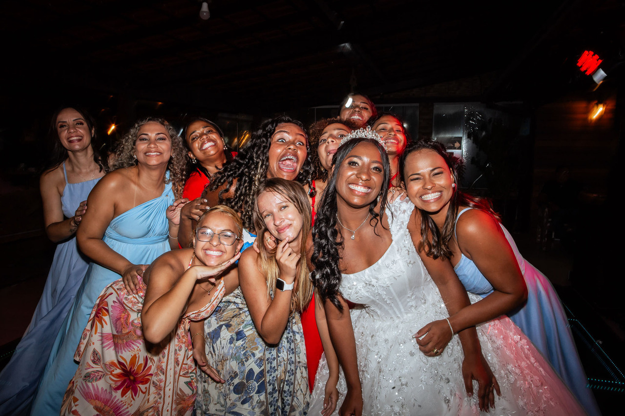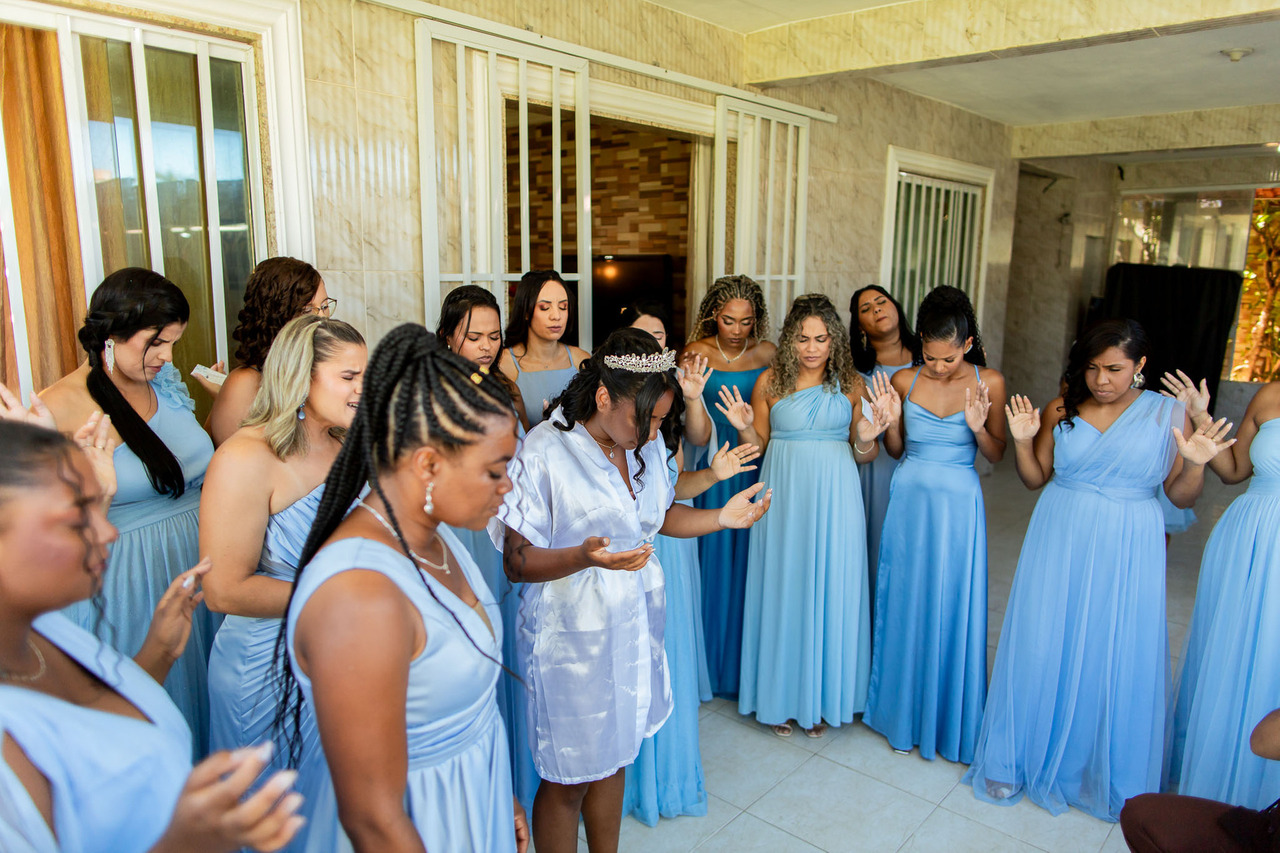Antes do encontro com os pais, Rayane viveu um momento marcante com suas madrinhas. Cercada por amigas, todas em uma mesma paleta de cores, aconteceu um momento de oração profundo, intenso e cheio da presença de Deus.