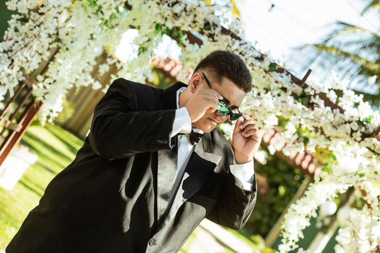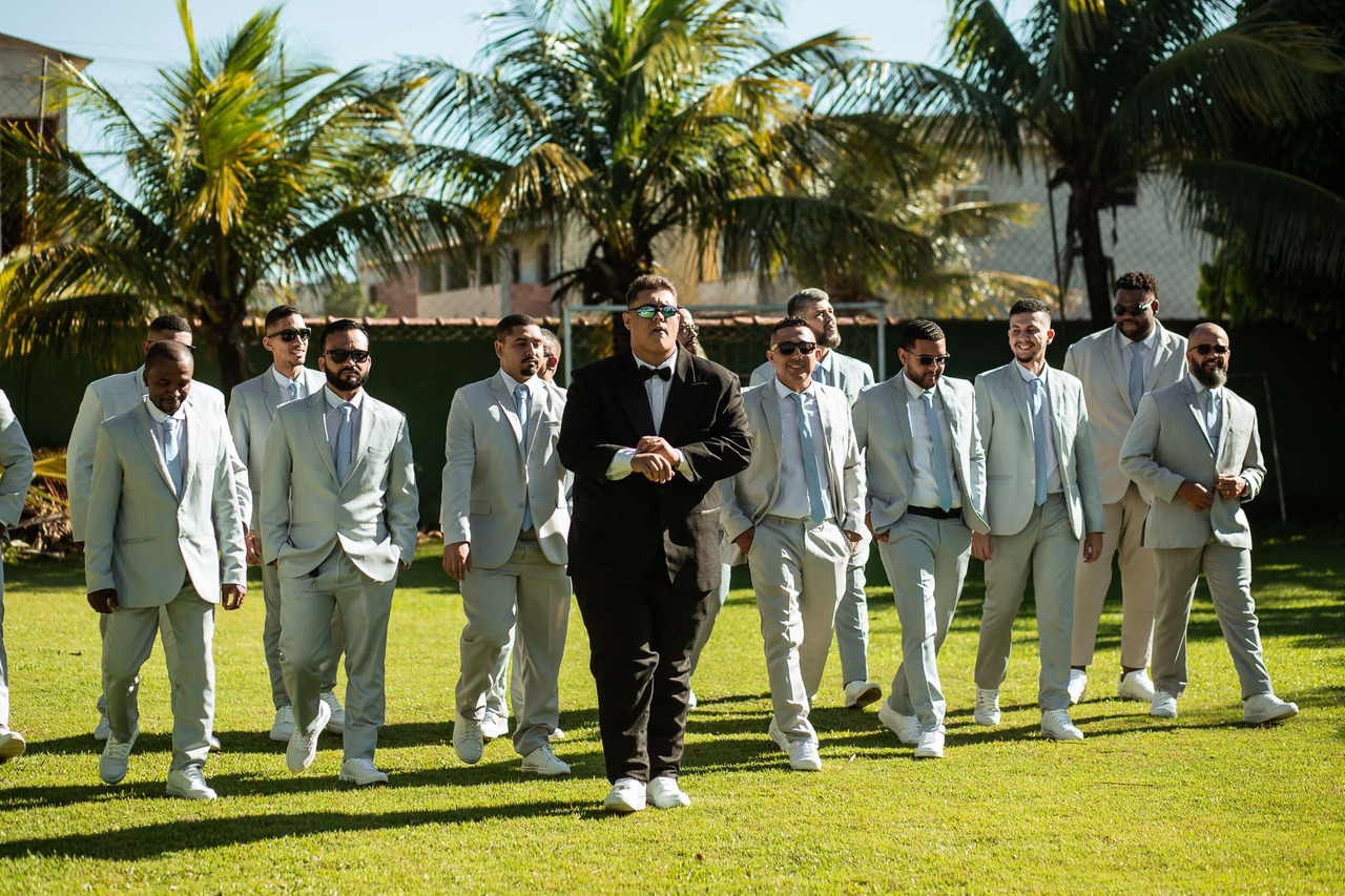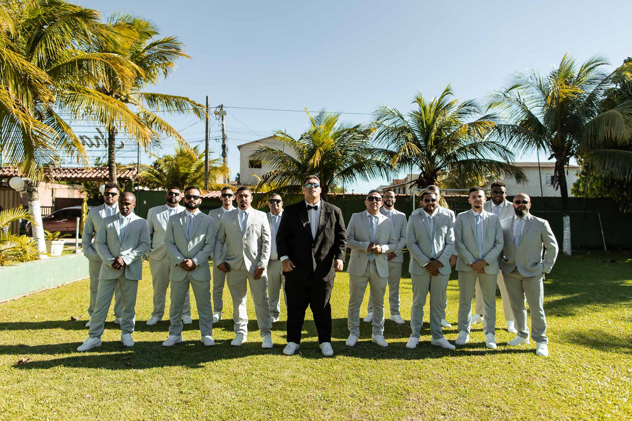Após o making of da noiva, seguimos para a área externa do Sítio Shalom, onde Matheus já estava pronto. Realizamos fotos do noivo com os padrinhos, além de retratos individuais, revelando serenidade, expectativa e alegria.