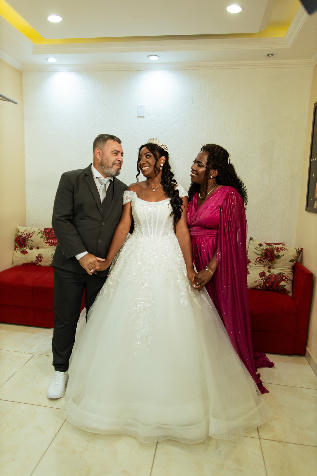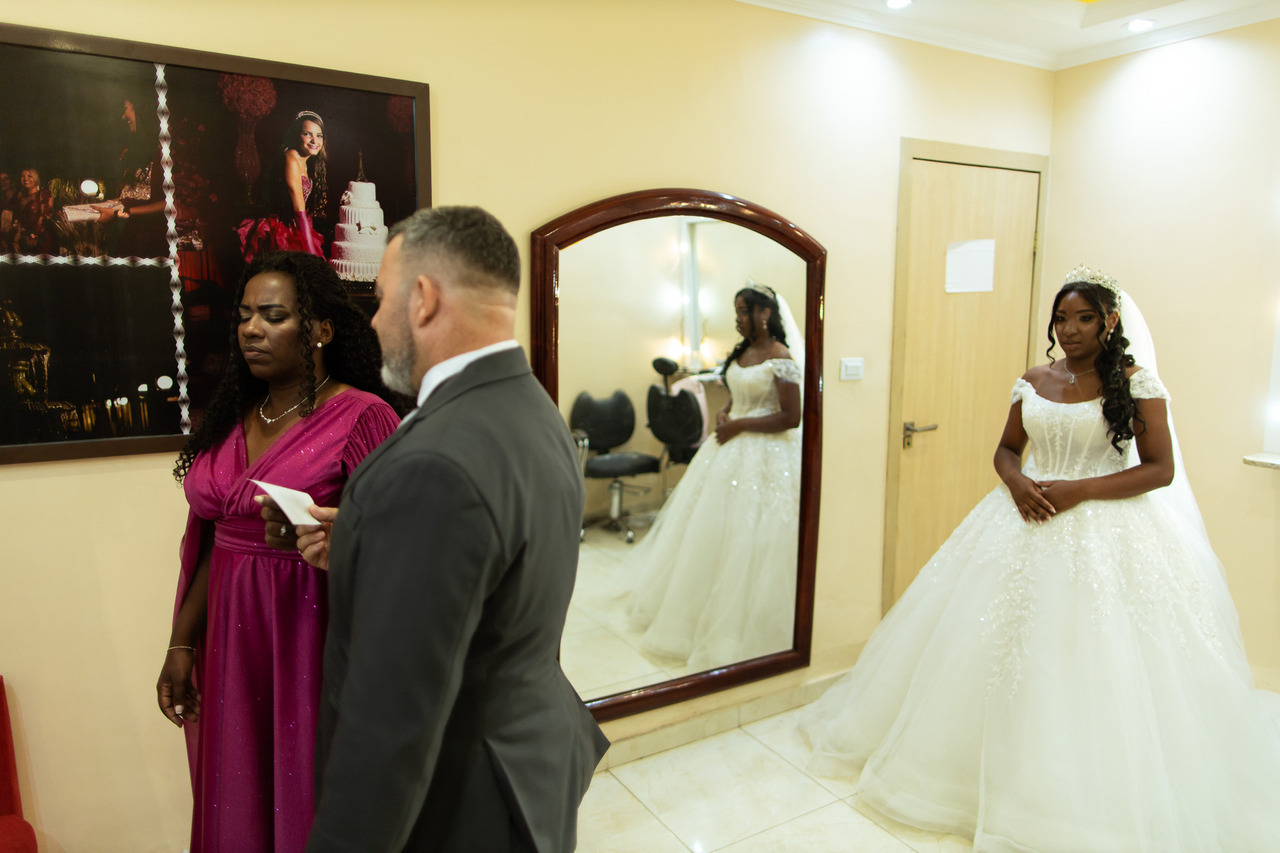 Já pronta, maquiada e vestida de noiva, Rayane preparou uma surpresa para seus pais. Eles estavam de costas, segurando a fotografia dela ainda criança.
