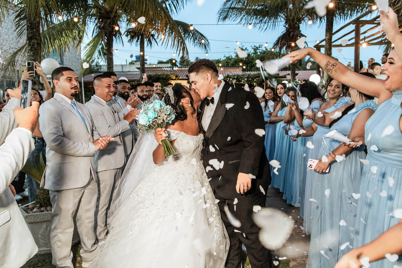 E a saída dos noivos foi celebrada com chuva de pétalas, sorrisos e muita alegria.