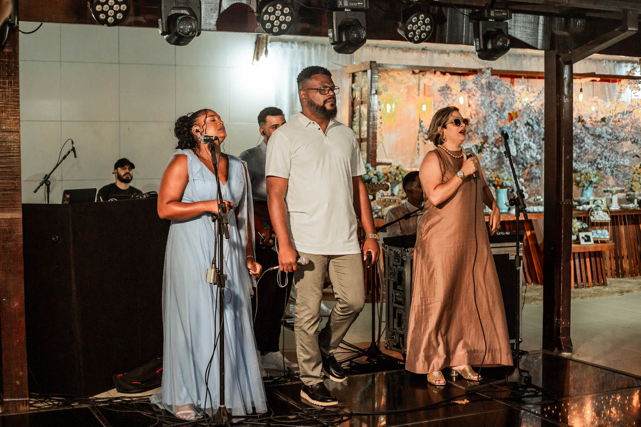 Toda a cerimônia foi conduzida pelo louvor da igreja, com participação da esposa do pastor, madrinhas, amigos e músicos, criando um ambiente de adoração.