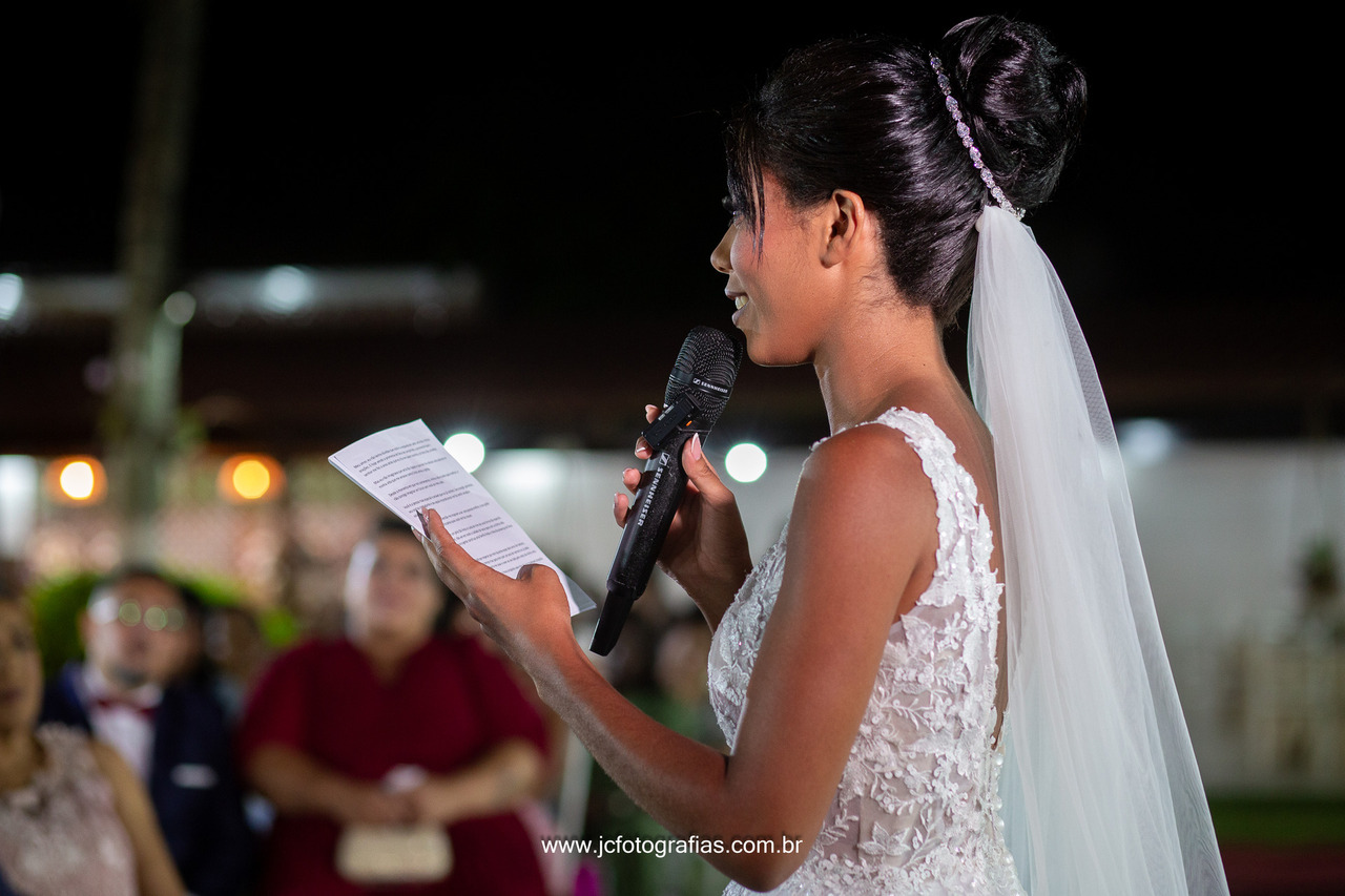 A noiva, Jayane, declarou seu amor e admiração ao João. Compartilhou seu testemunho de que Deus é fiel para cumprir o que promete, e Ele havia prometido que ela se casaria ainda bem jovem. Ela também agradeceu ao seu amado por ter esperado por ela.
