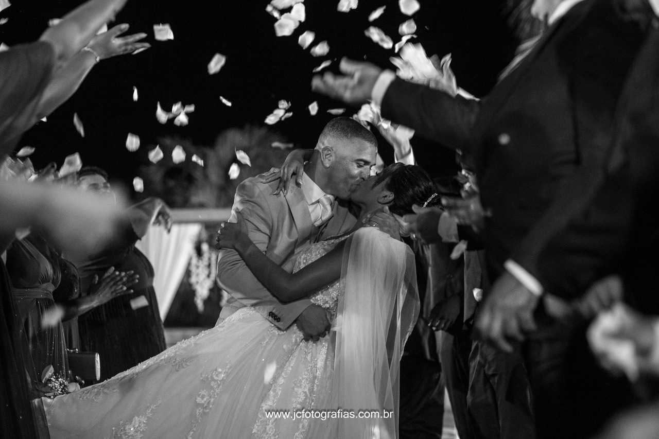Muita celebração na saída da cerimônia com chuva de pétalas brancas.